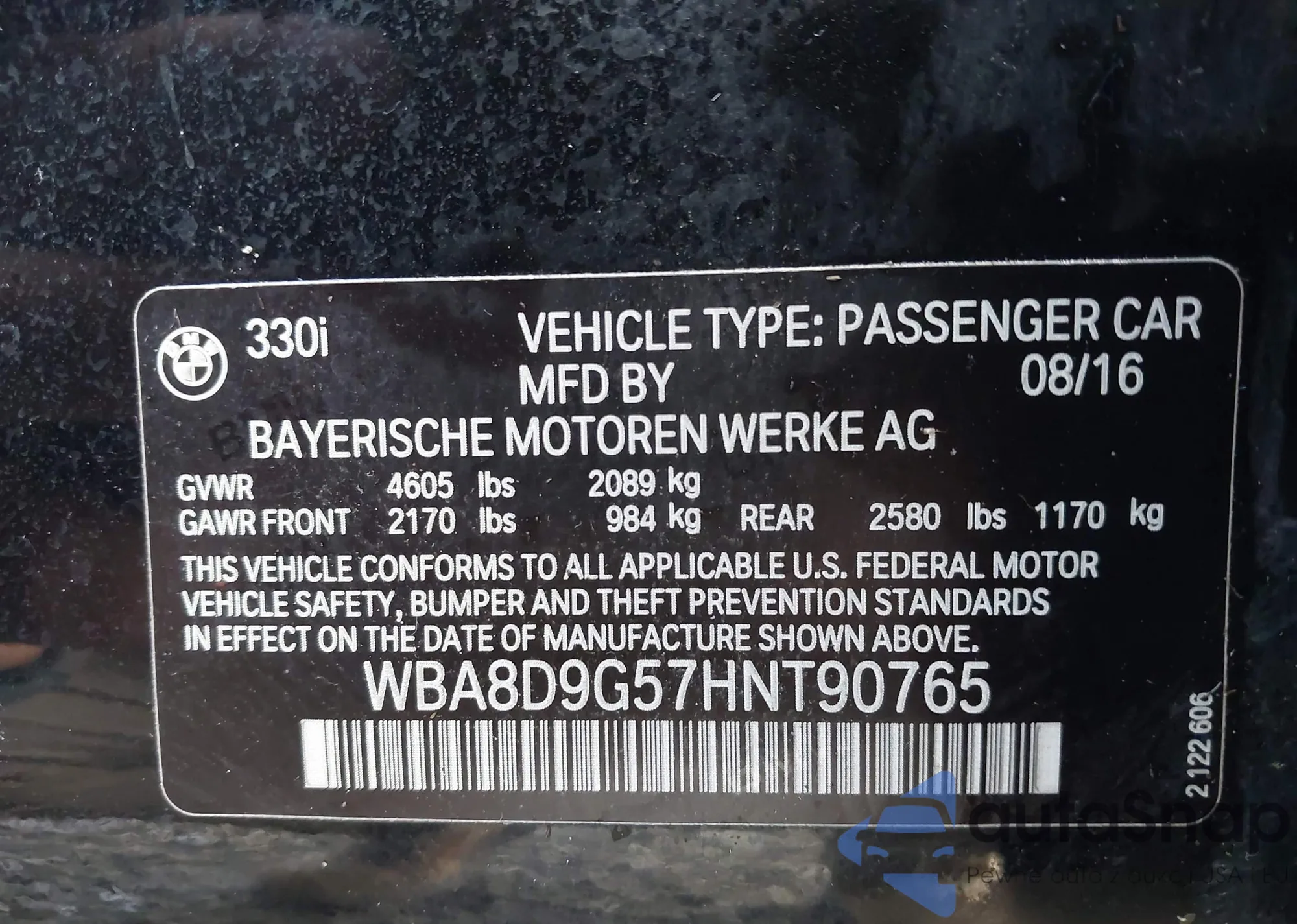 • VIN WBA8D9G57HNT90765