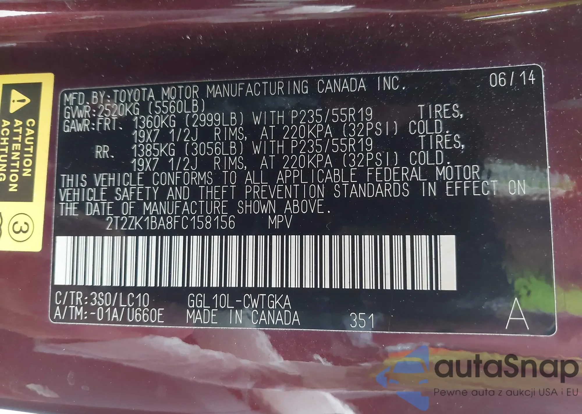 • VIN 2T2ZK1BA8FC158156