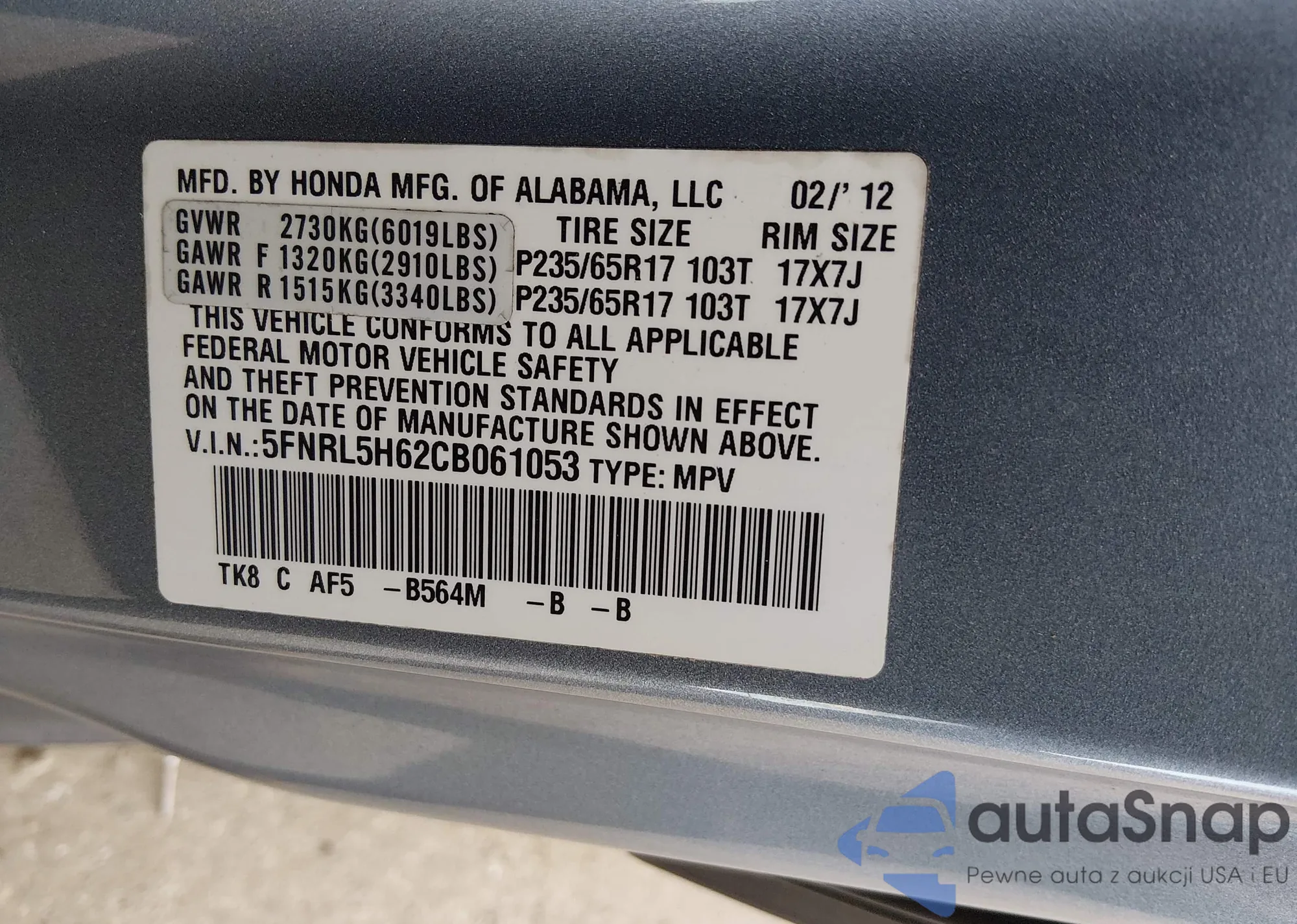 • VIN 5FNRL5H62CB061053