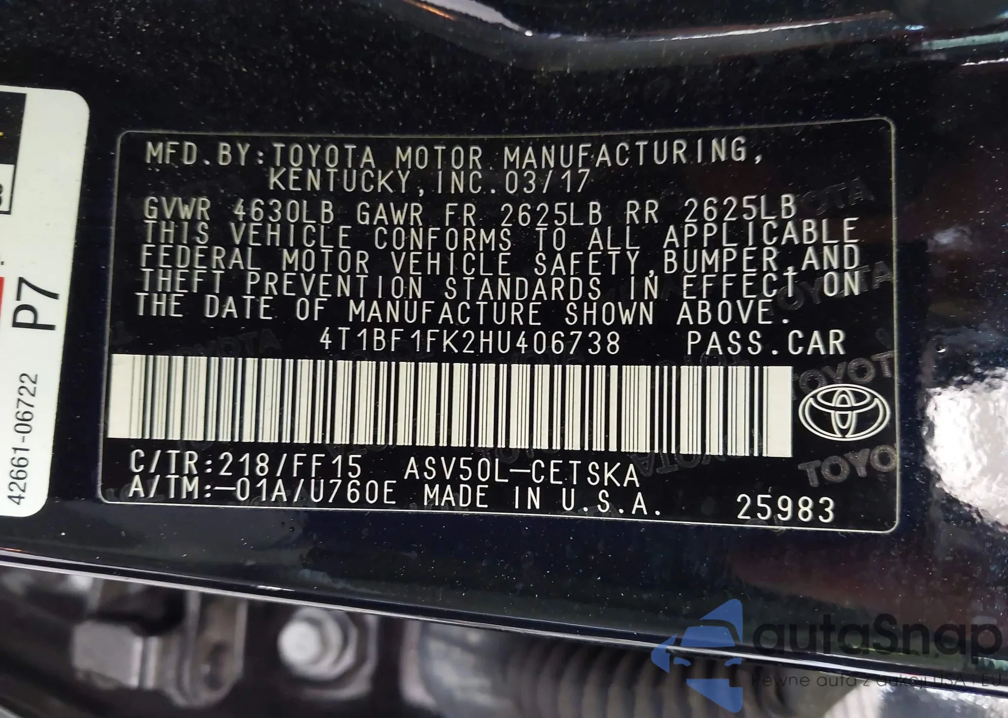 • VIN 4T1BF1FK2HU406738