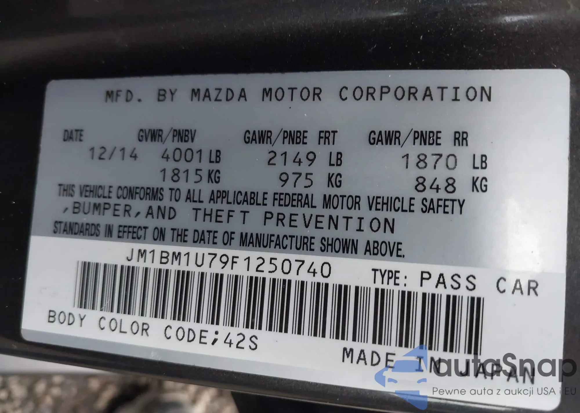 LOT: 44014137 VIN: JM1BM1U79F1250740