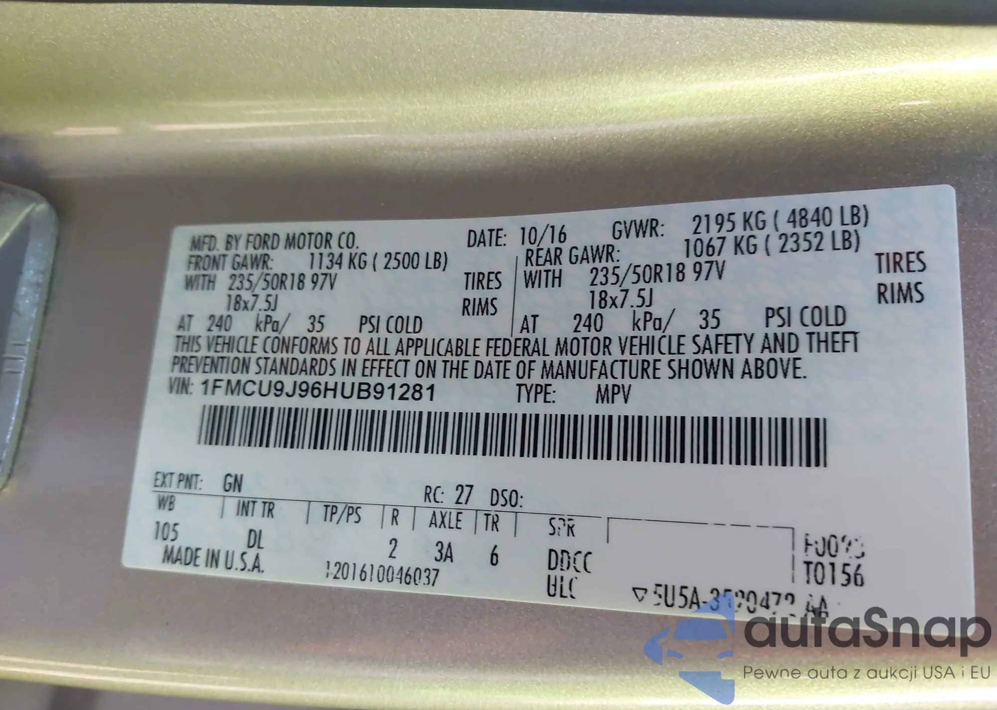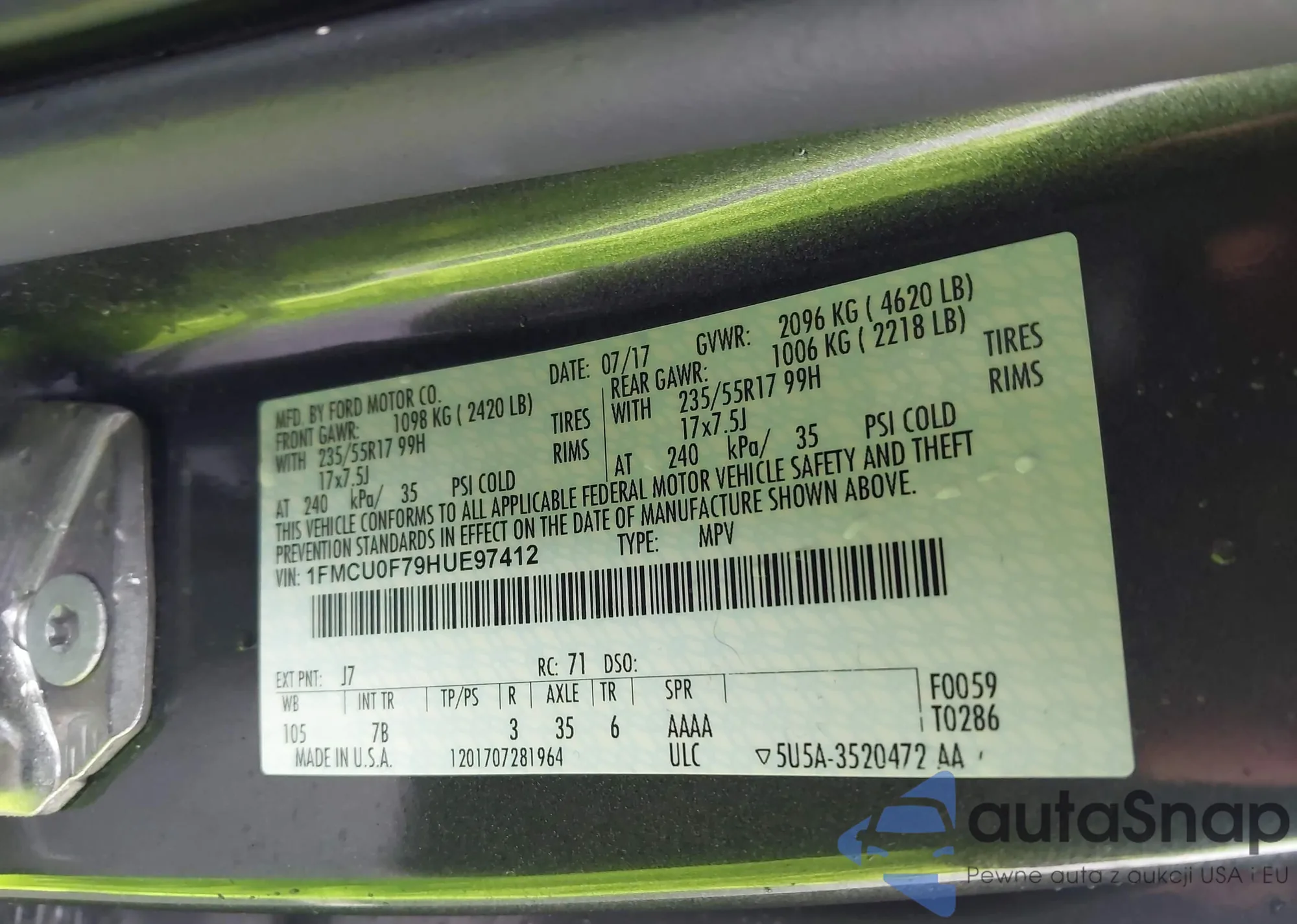 LOT: 44020614 VIN: 1FMCU0F79HUE97412