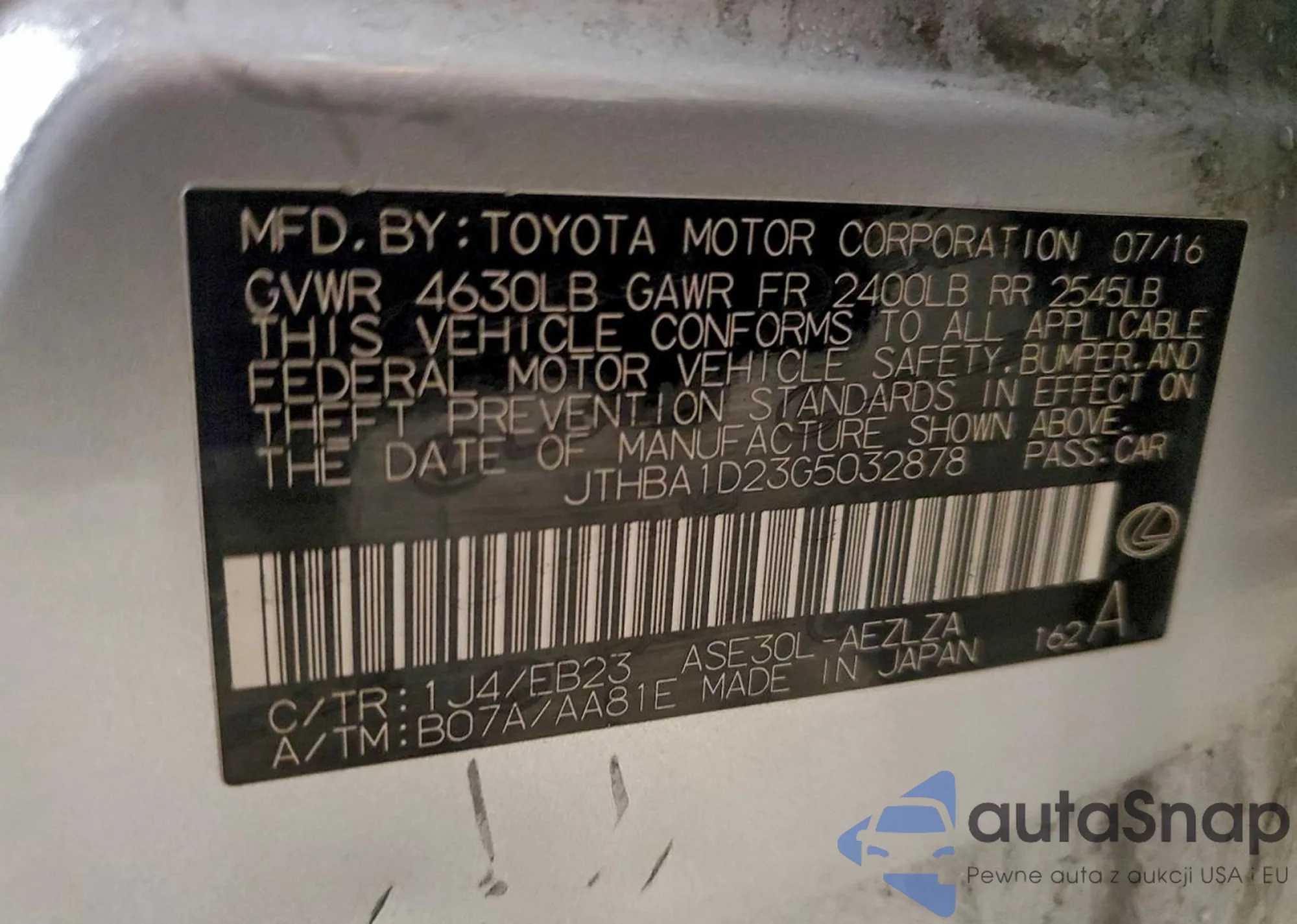 LOT: 97316635 VIN: JTHBA1D23G5032878