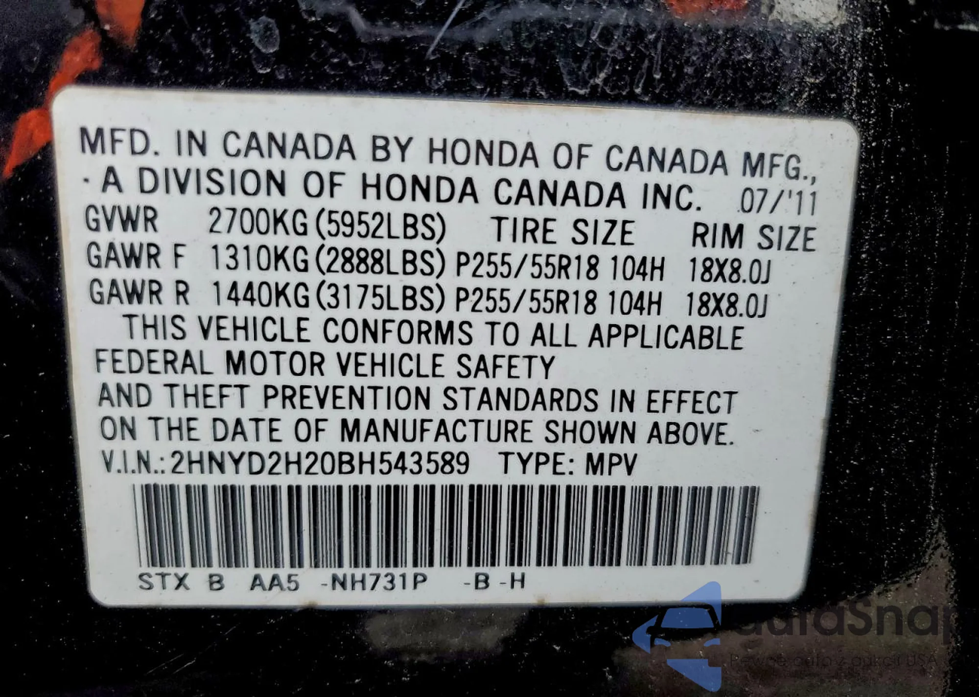 • VIN 2HNYD2H20BH543589