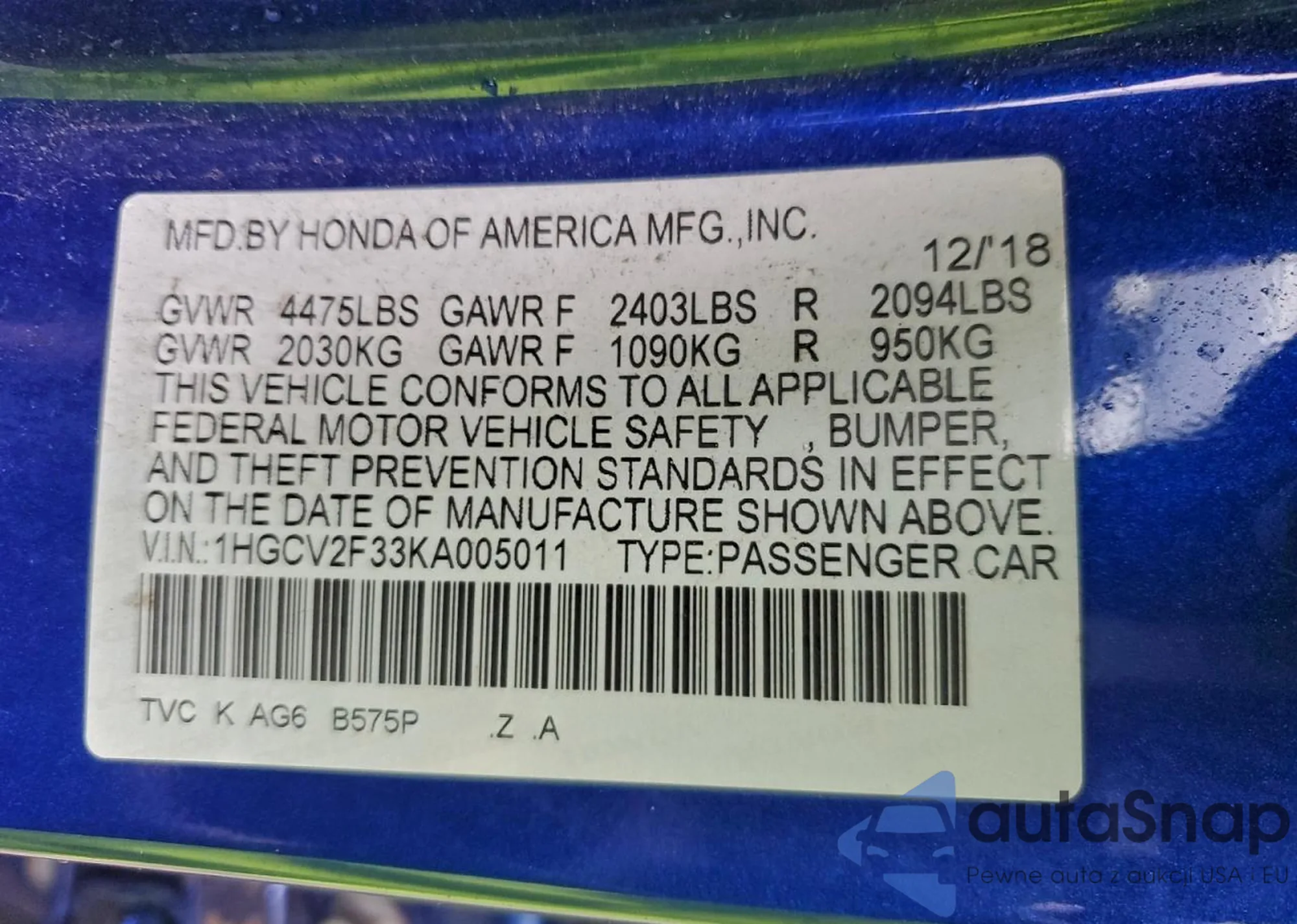 • VIN 1HGCV2F33KA005011