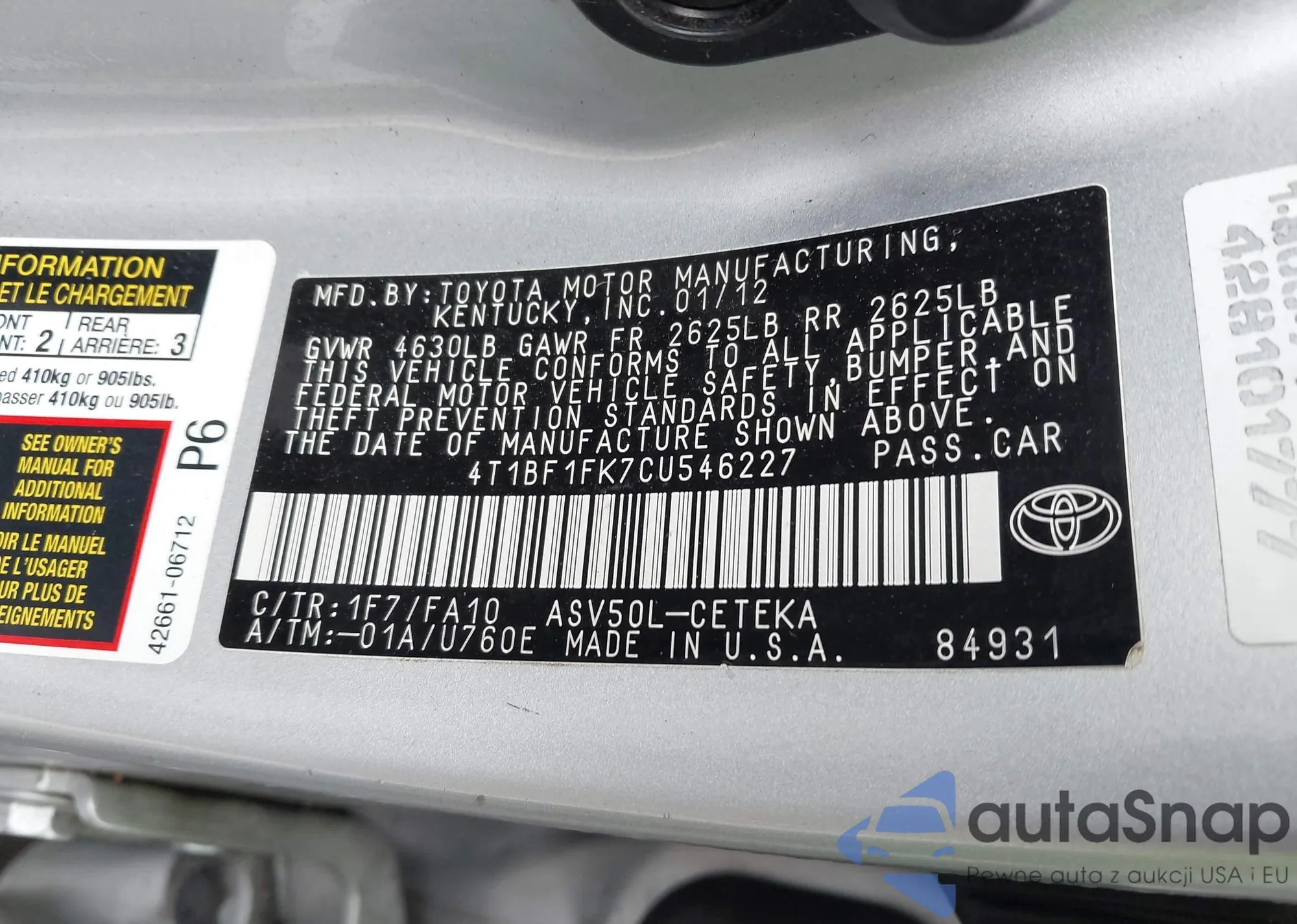 • VIN 4T1BF1FK7CU546227