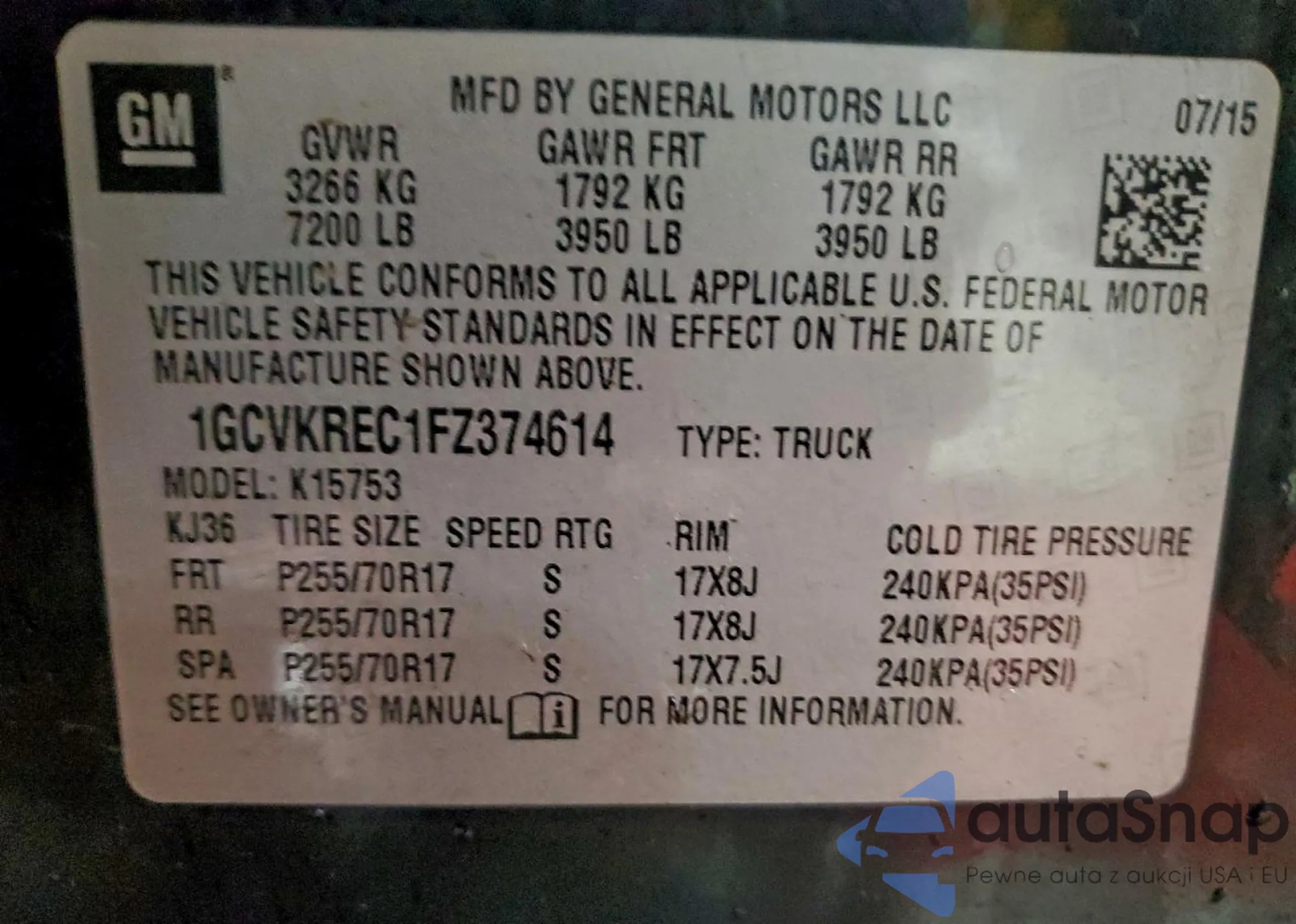 LOT: 95263845 VIN: 1GCVKREC1FZ374614