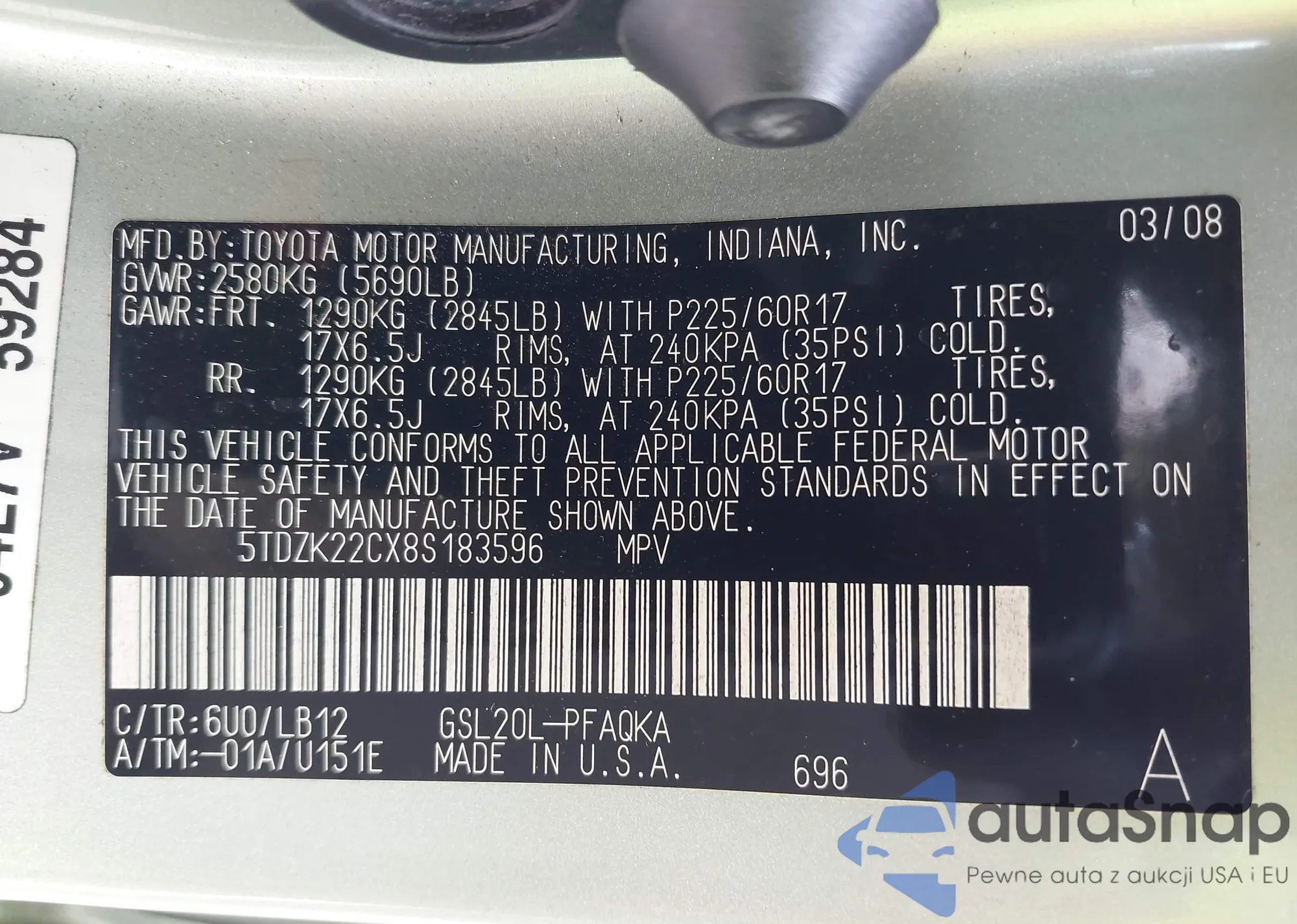 LOT: 43581926 VIN: 4T1F31AK4PU608710