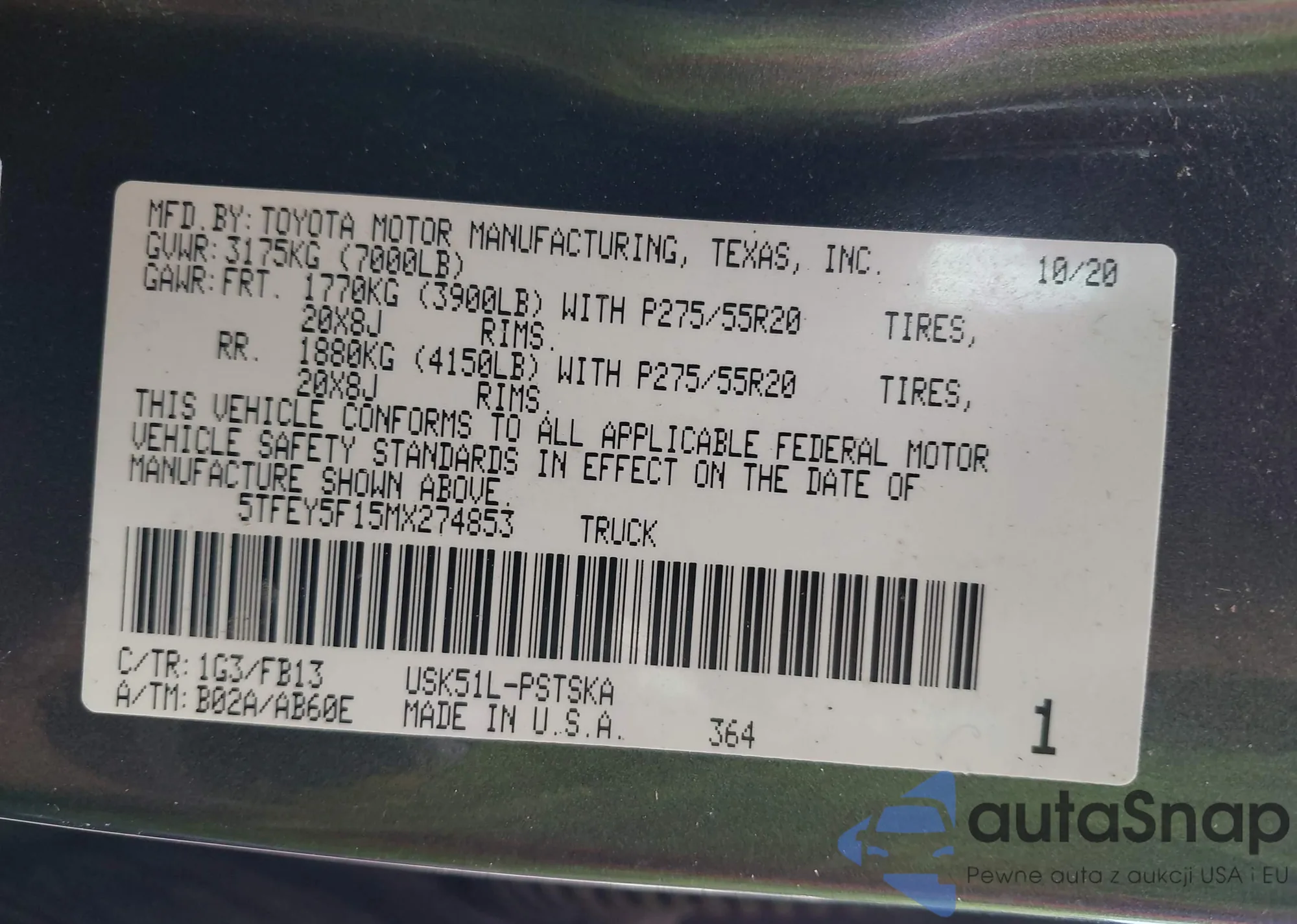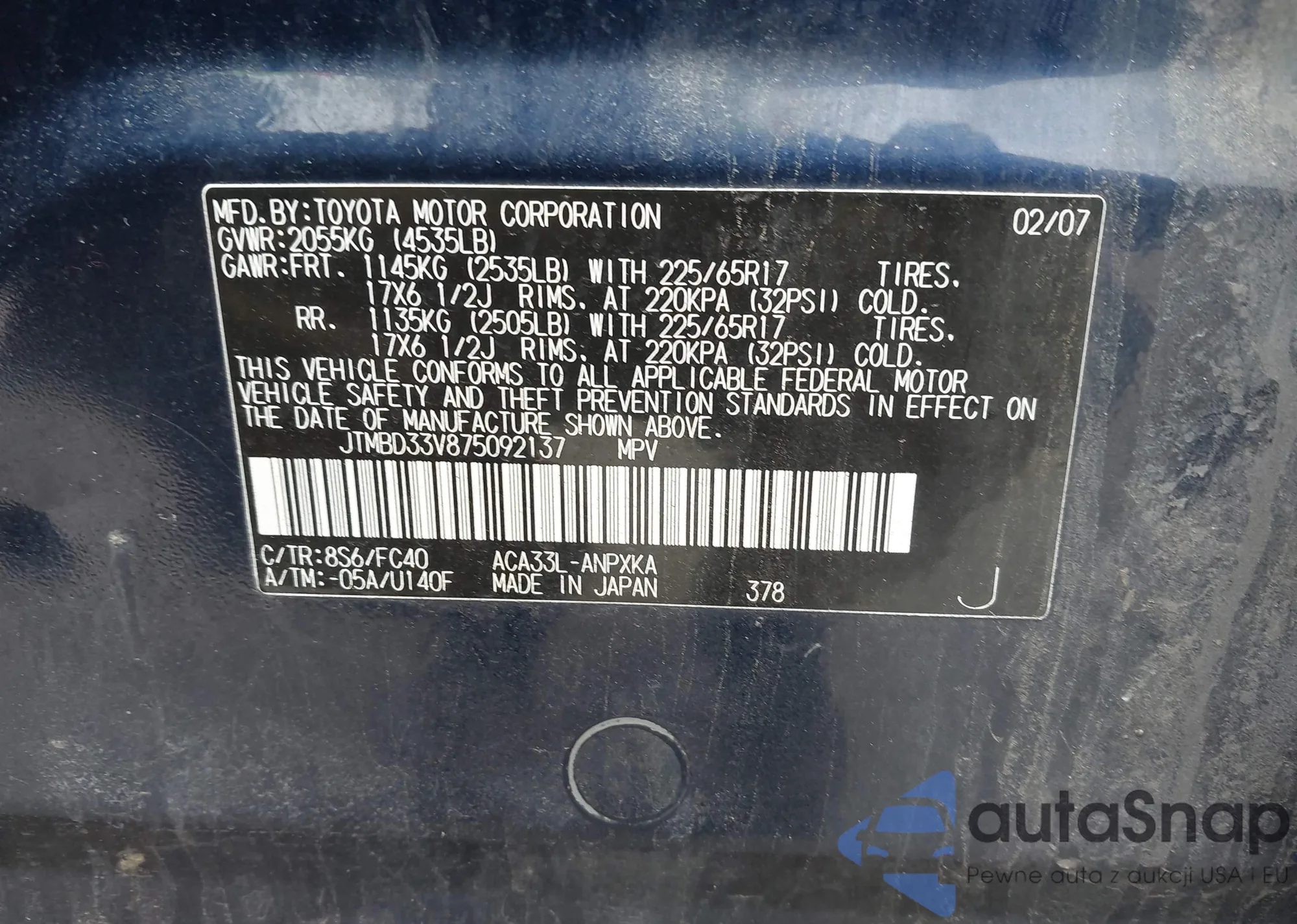 LOT: 43762506 VIN: JTMBD33V875092137
