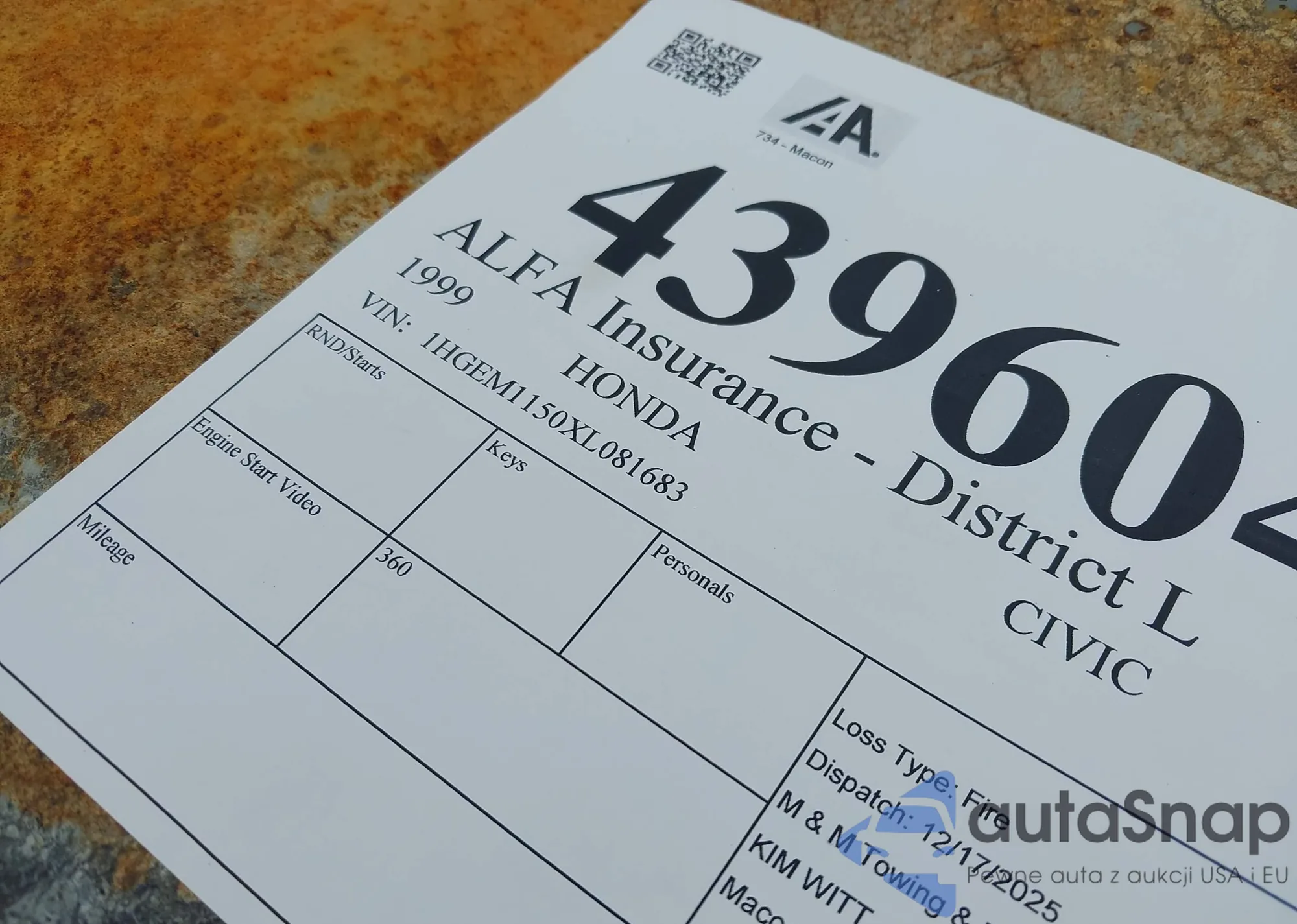 LOT: 43960466 VIN: 1HGEM1150XL081683