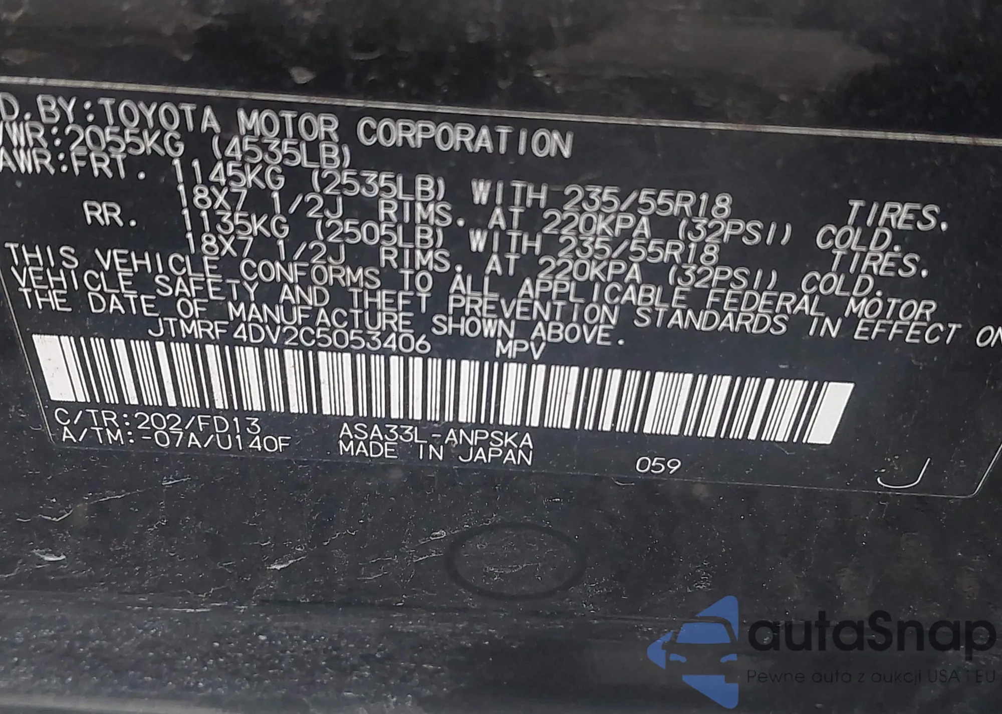 LOT: 43971732 VIN: JTMRF4DV2C5053406