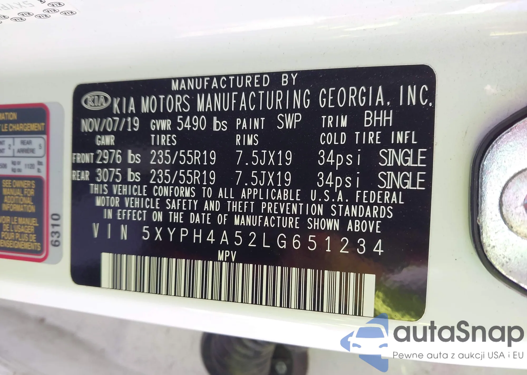 LOT: 43626841 VIN: 5XYPH4A52LG651234
