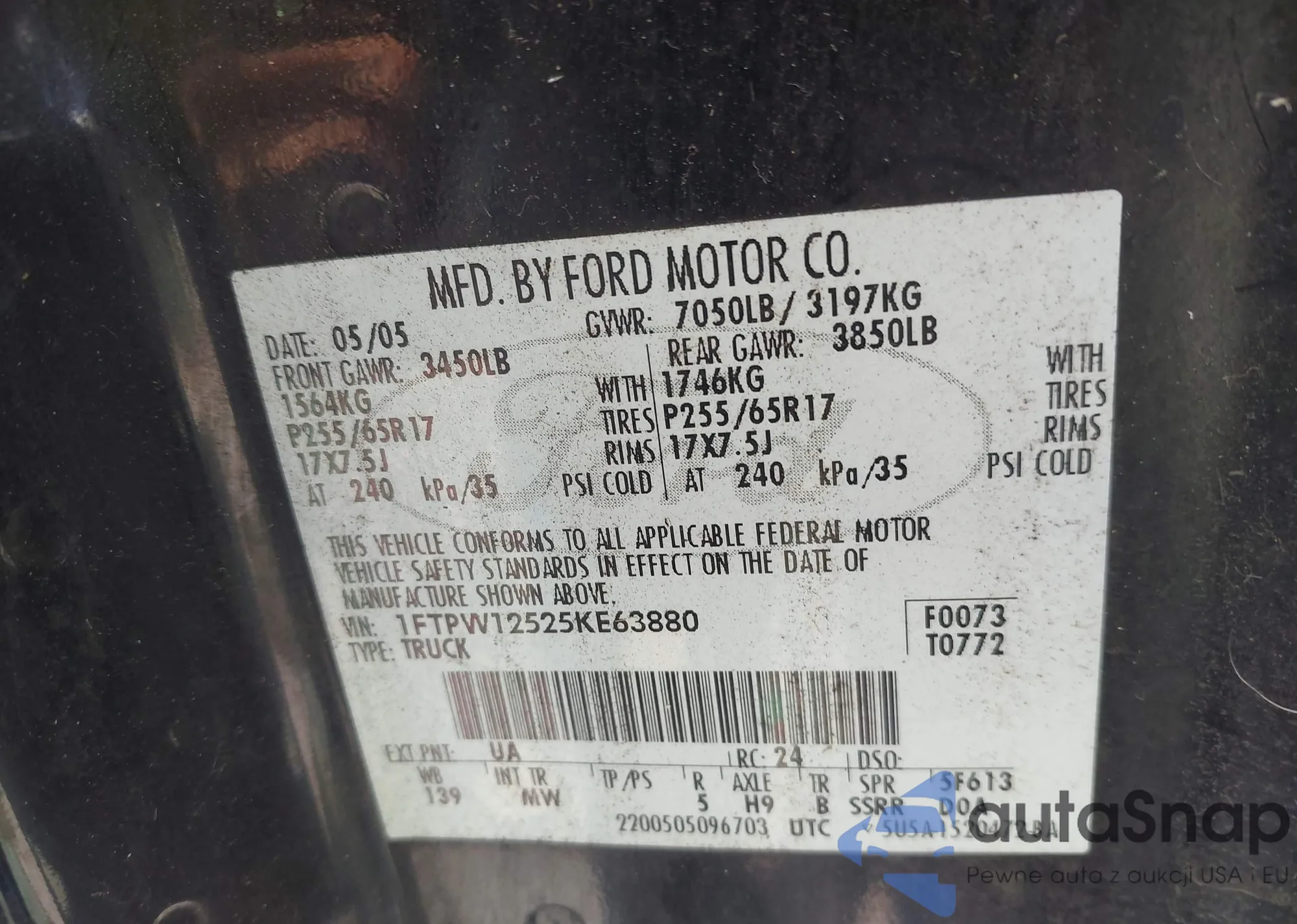 LOT: 43727530 VIN: 1FTPW12525KE63H80
