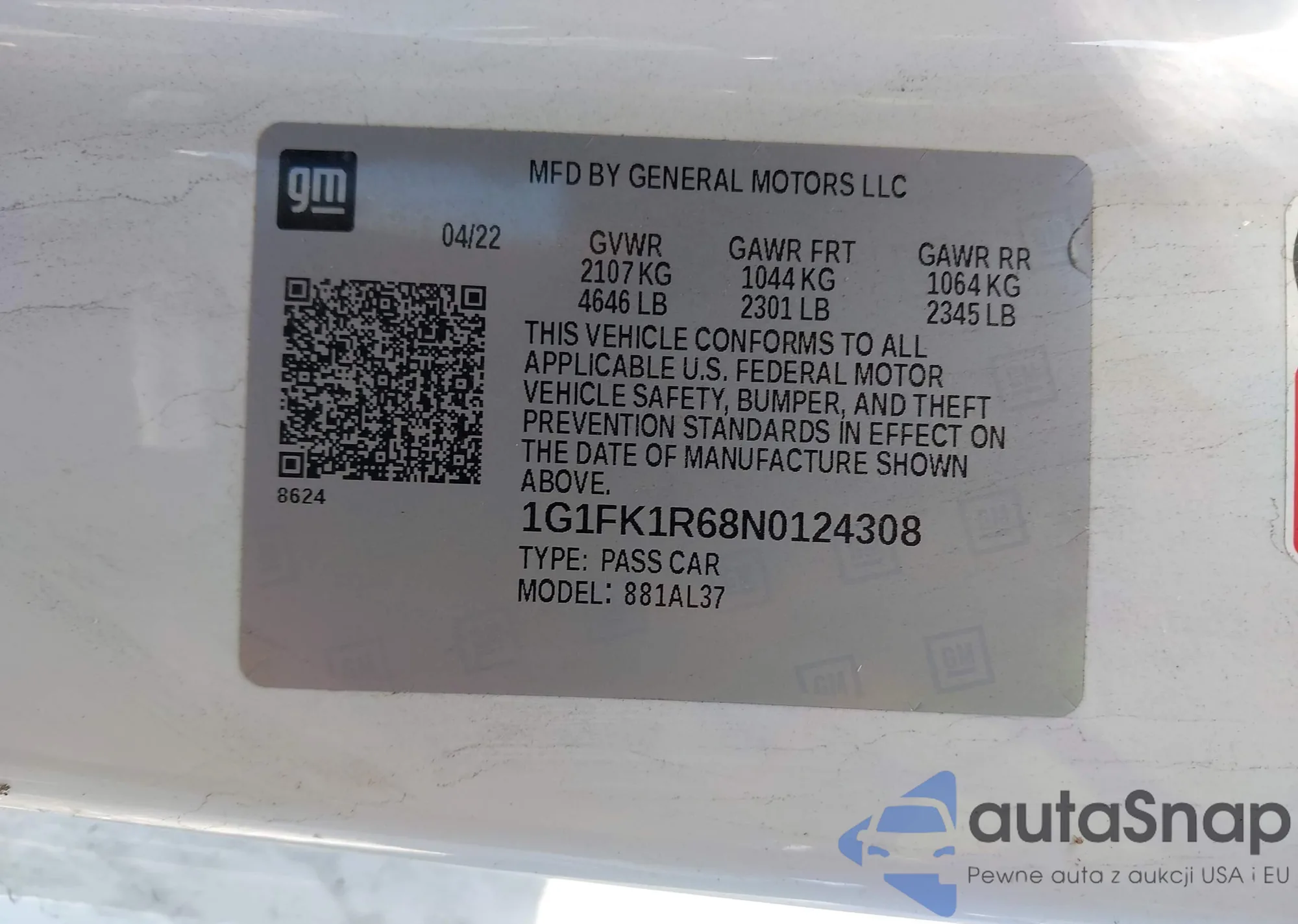 LOT: 43955501 VIN: 1G1FK1R68N0124308