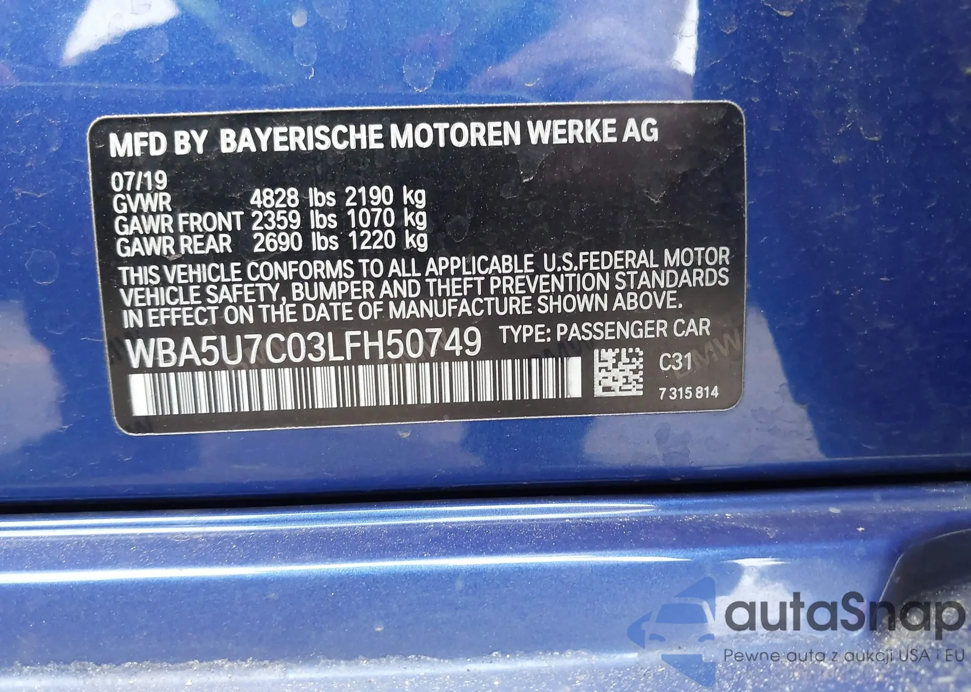 • VIN WBA5U7C03LFH50749