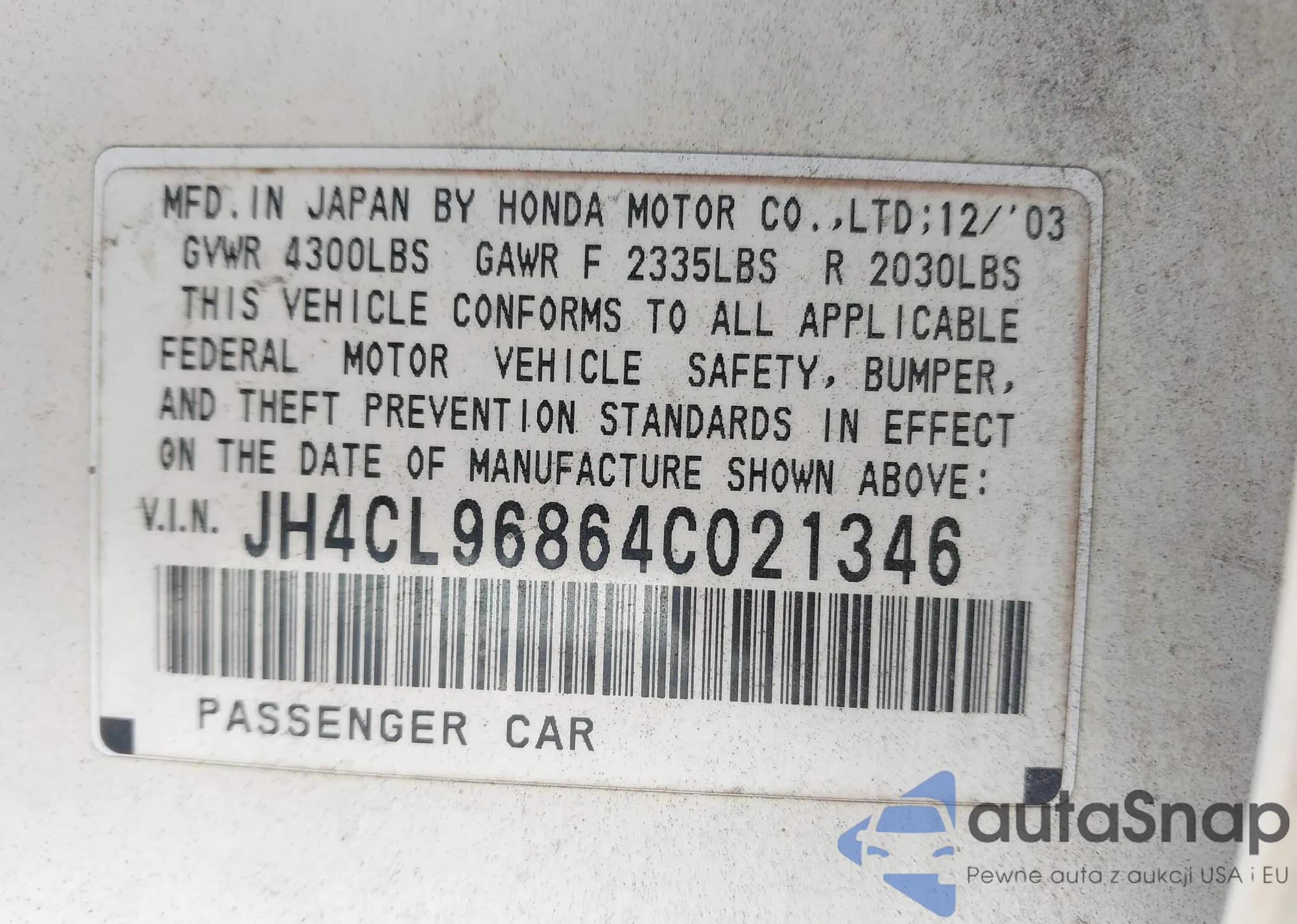 LOT: 43997854 VIN: JH4CL96864C021346