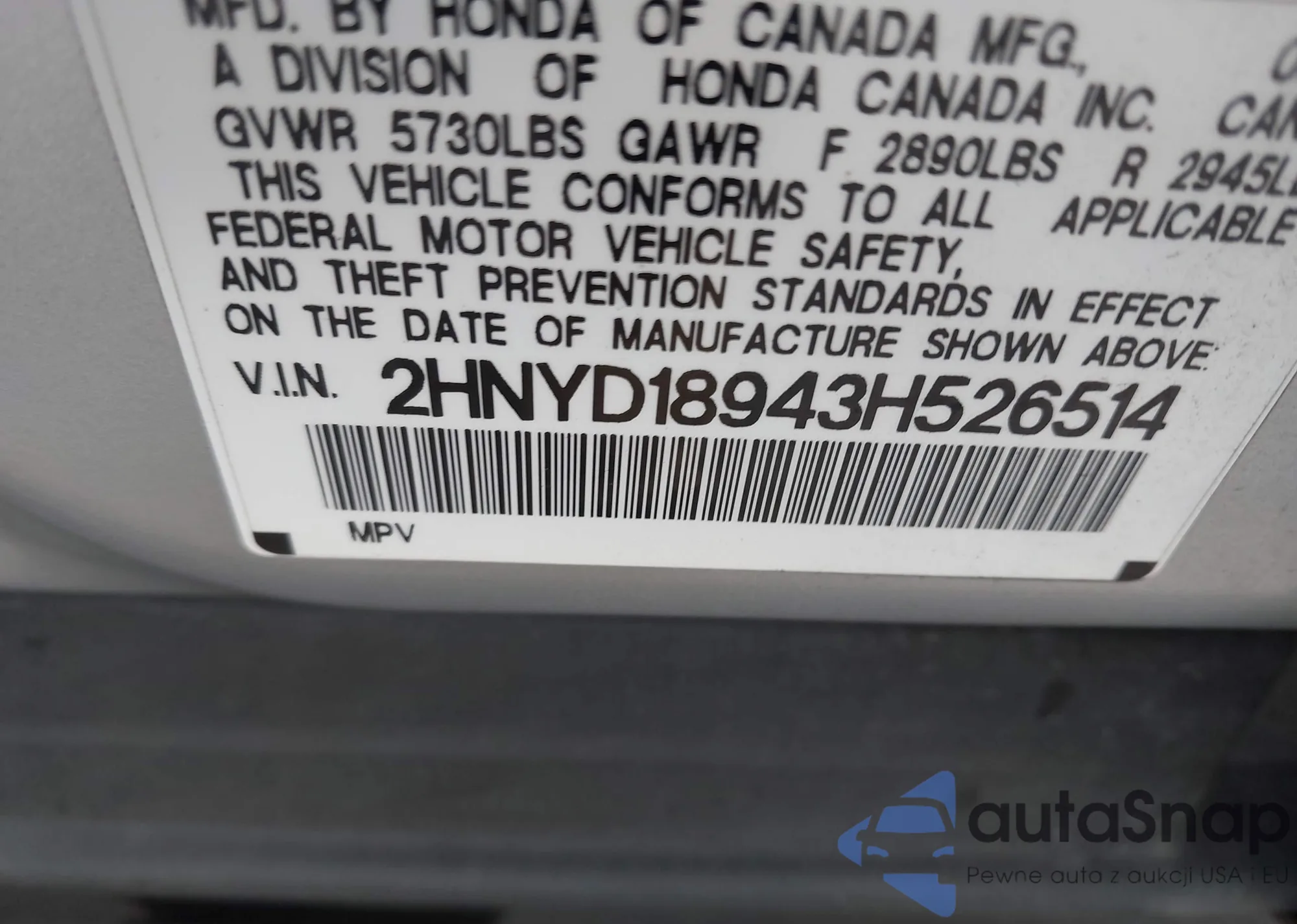 LOT: 44077060 VIN: 2HNYD18943H526514
