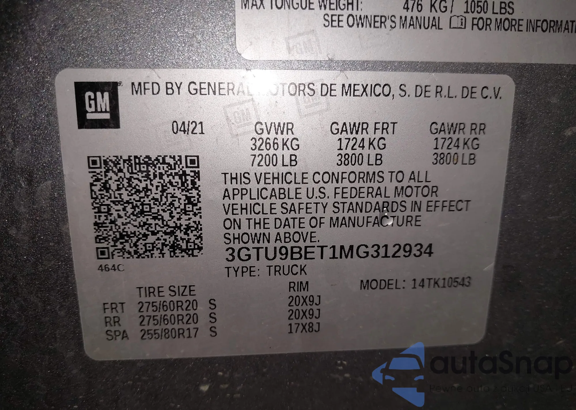 • VIN 3GTU9BET1MG312934