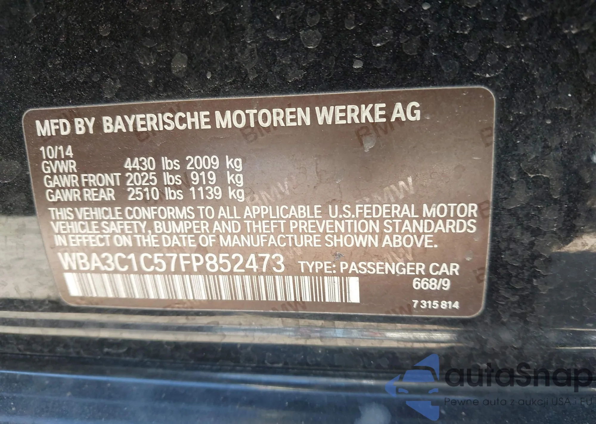 LOT: 43920503 VIN: WBA3C1C57FP852473
