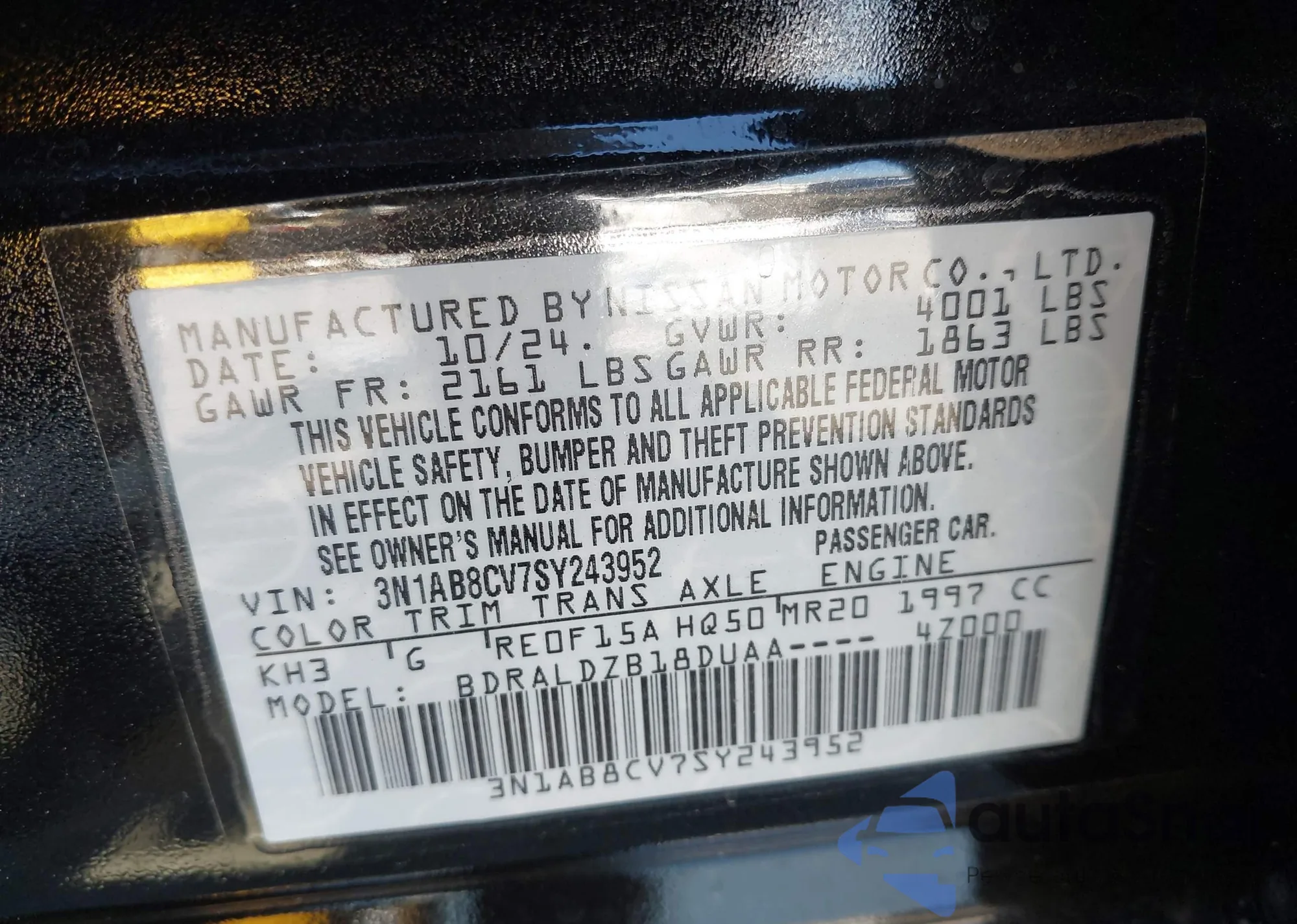 LOT: 43606104 VIN: 3N1AB8CV7SY243952