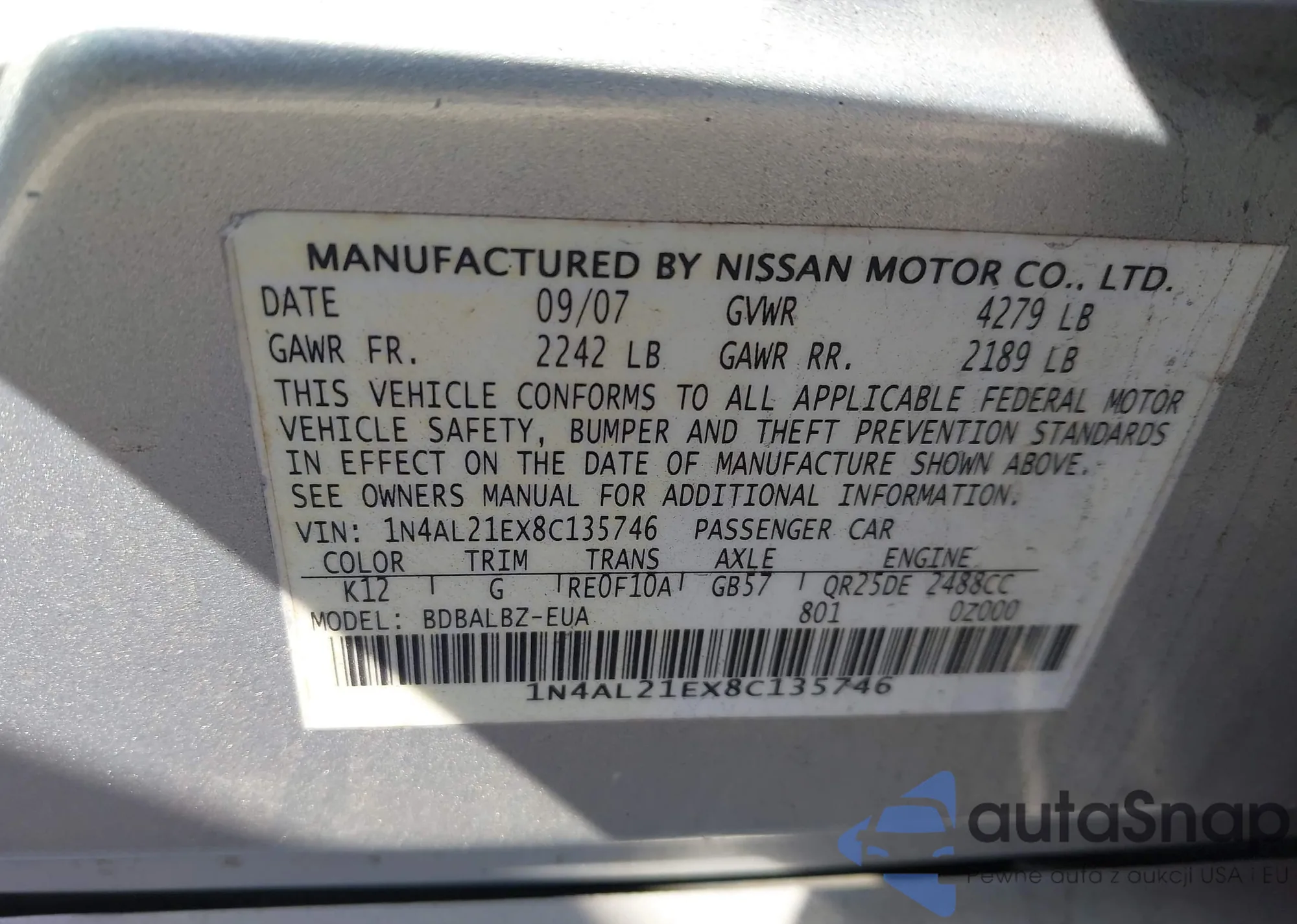 LOT: 43693178 VIN: 1N4AL21EX8C135746