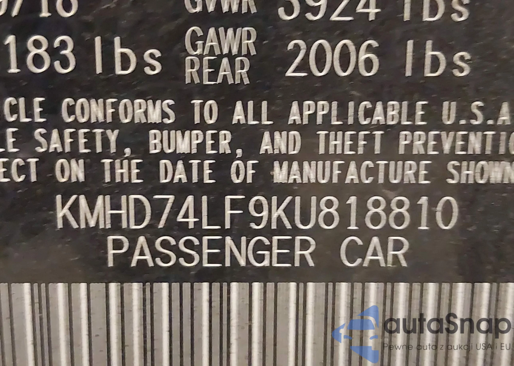 LOT: 43789938 VIN: KMHD74LF9KU818810