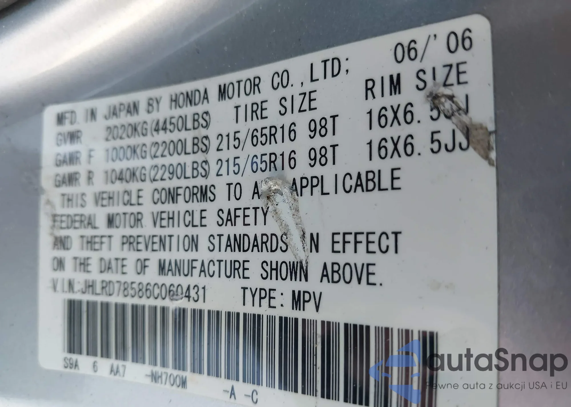 • VIN JHLRD78586C060431
