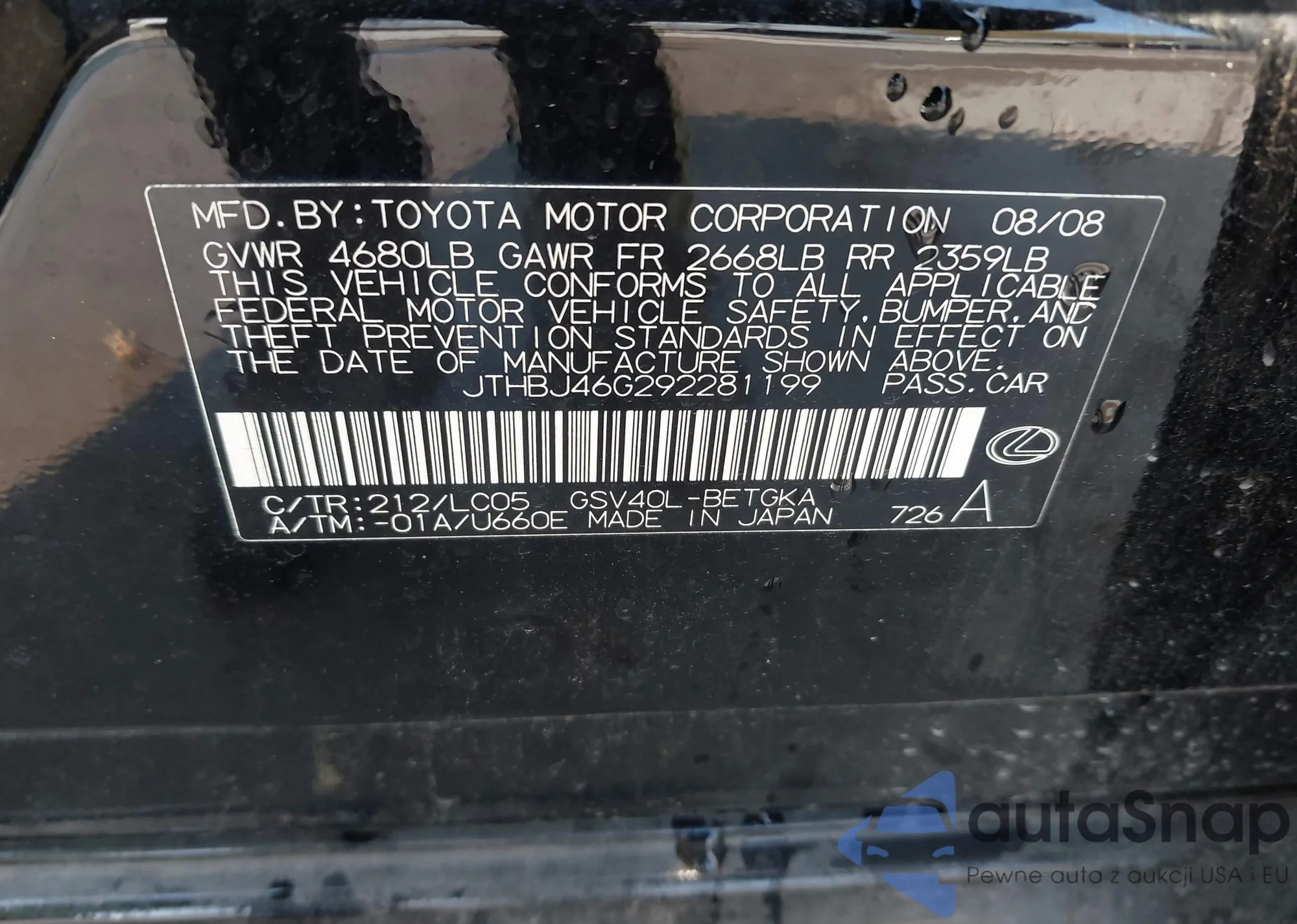 LOT: 43735624 VIN: JTHBJ46G292281199