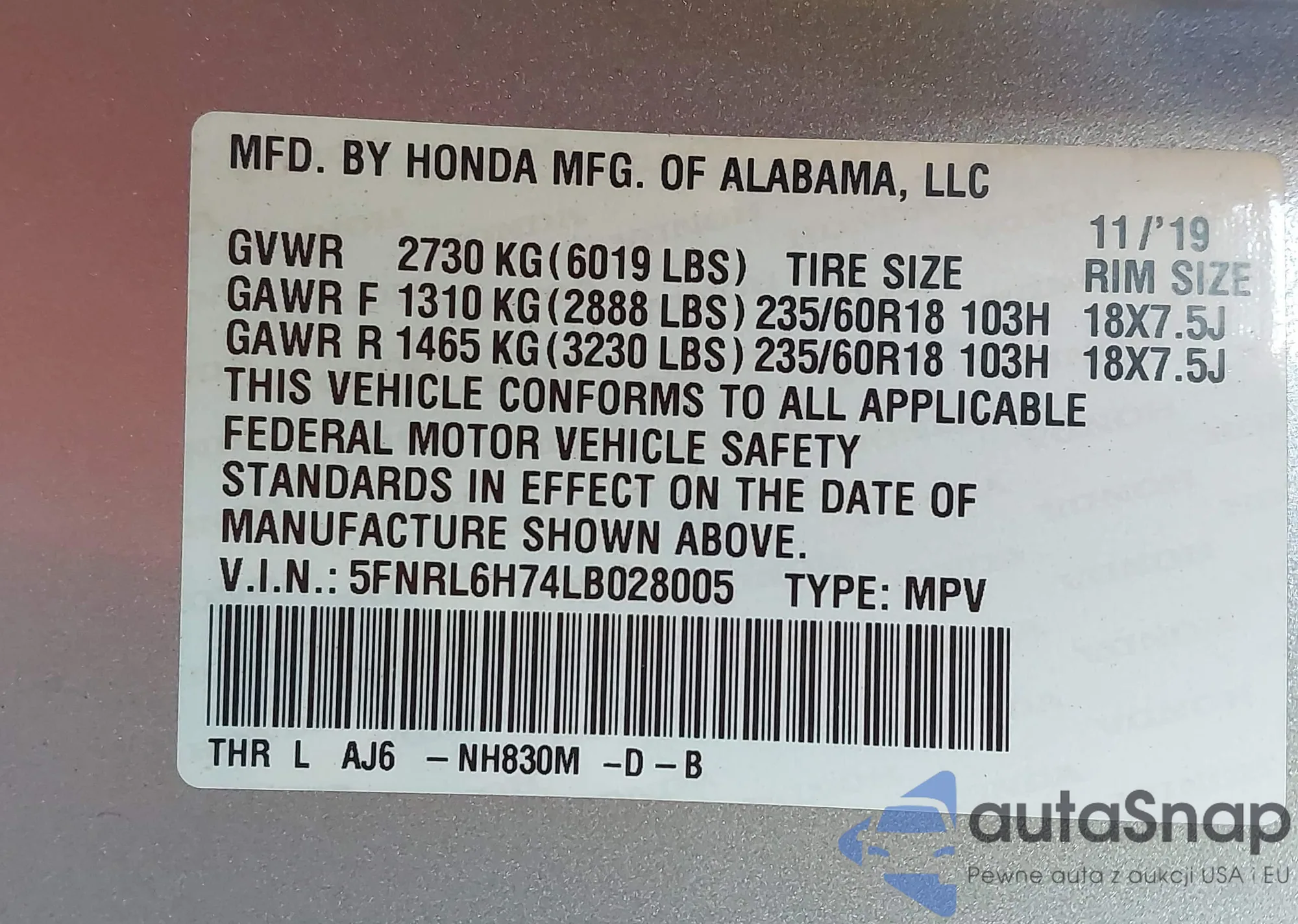 • VIN 5FNYF4H55EB021637