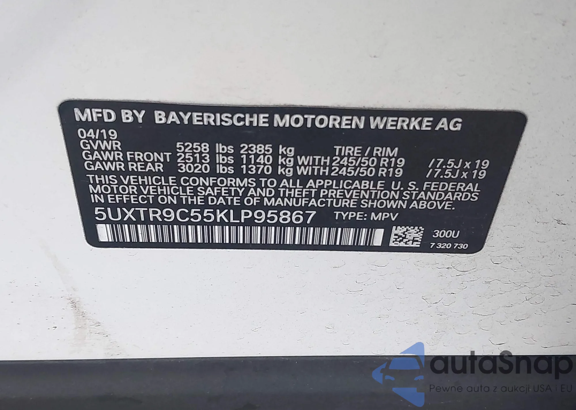 LOT: 43877670 VIN: 5UXTR9C55KLP95867