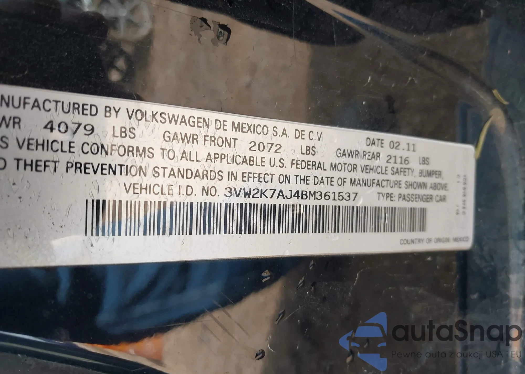 • VIN 3VW2K7AJ4BM361537
