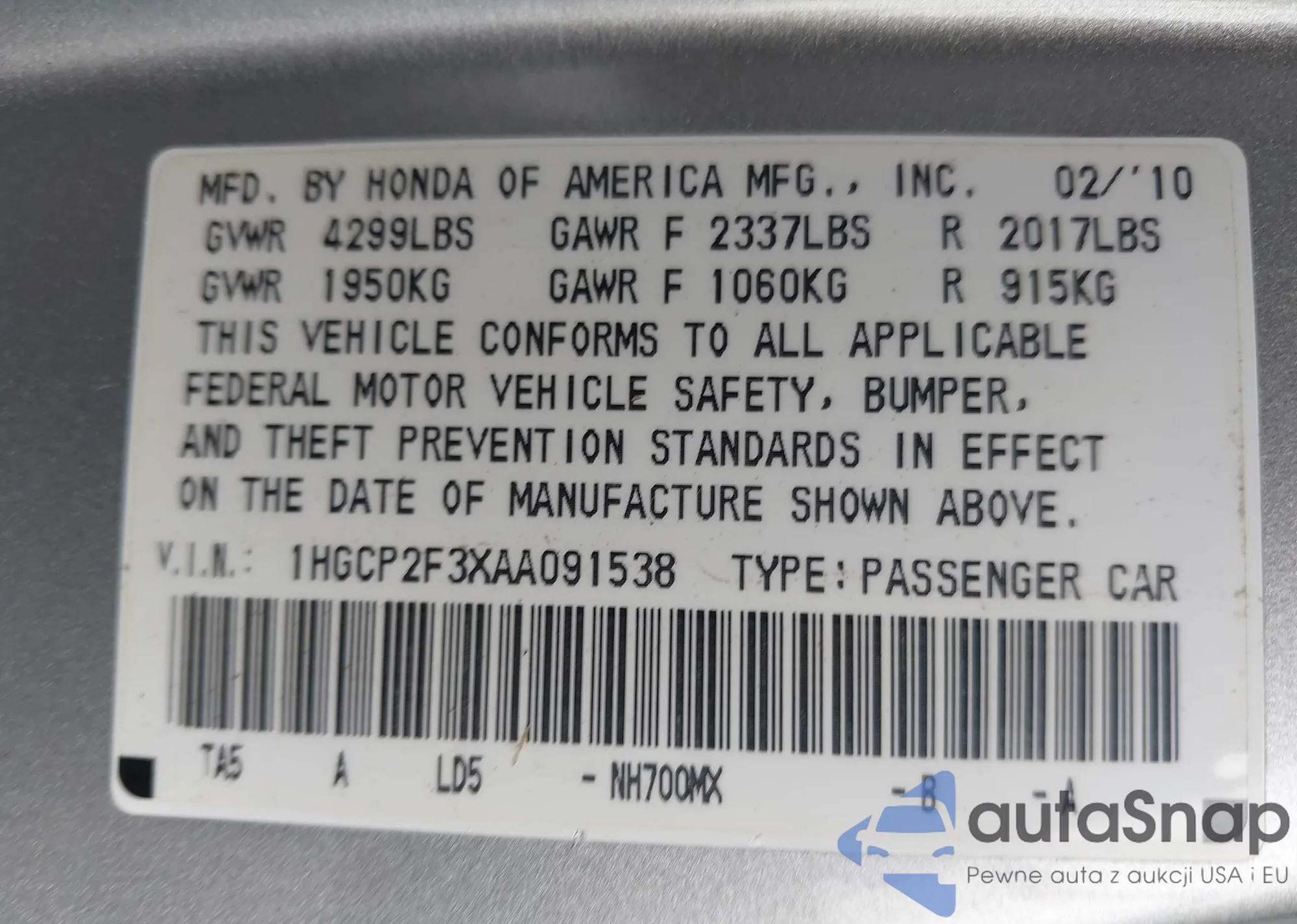 LOT: 43321670 VIN: 1HGCP2F3XAA091538