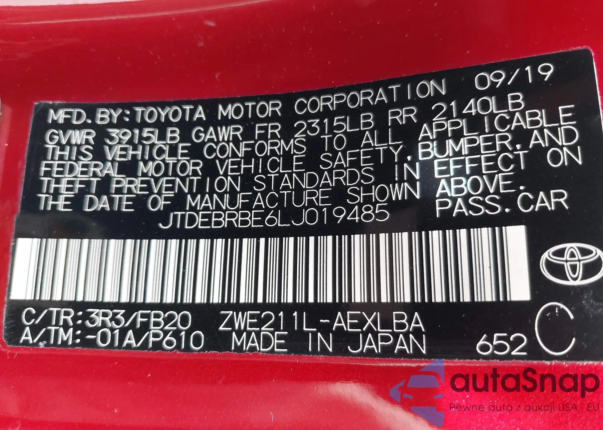 LOT: 43335693 VIN: JTDEBRBE6LJ019485