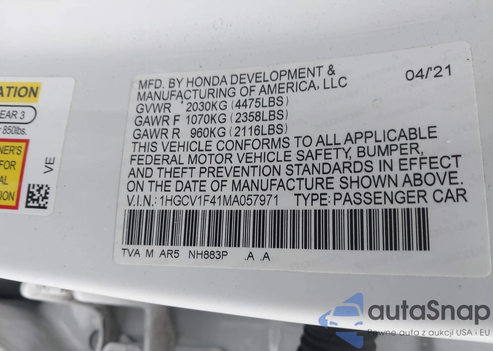 • VIN 1HGCV1F41MA057971