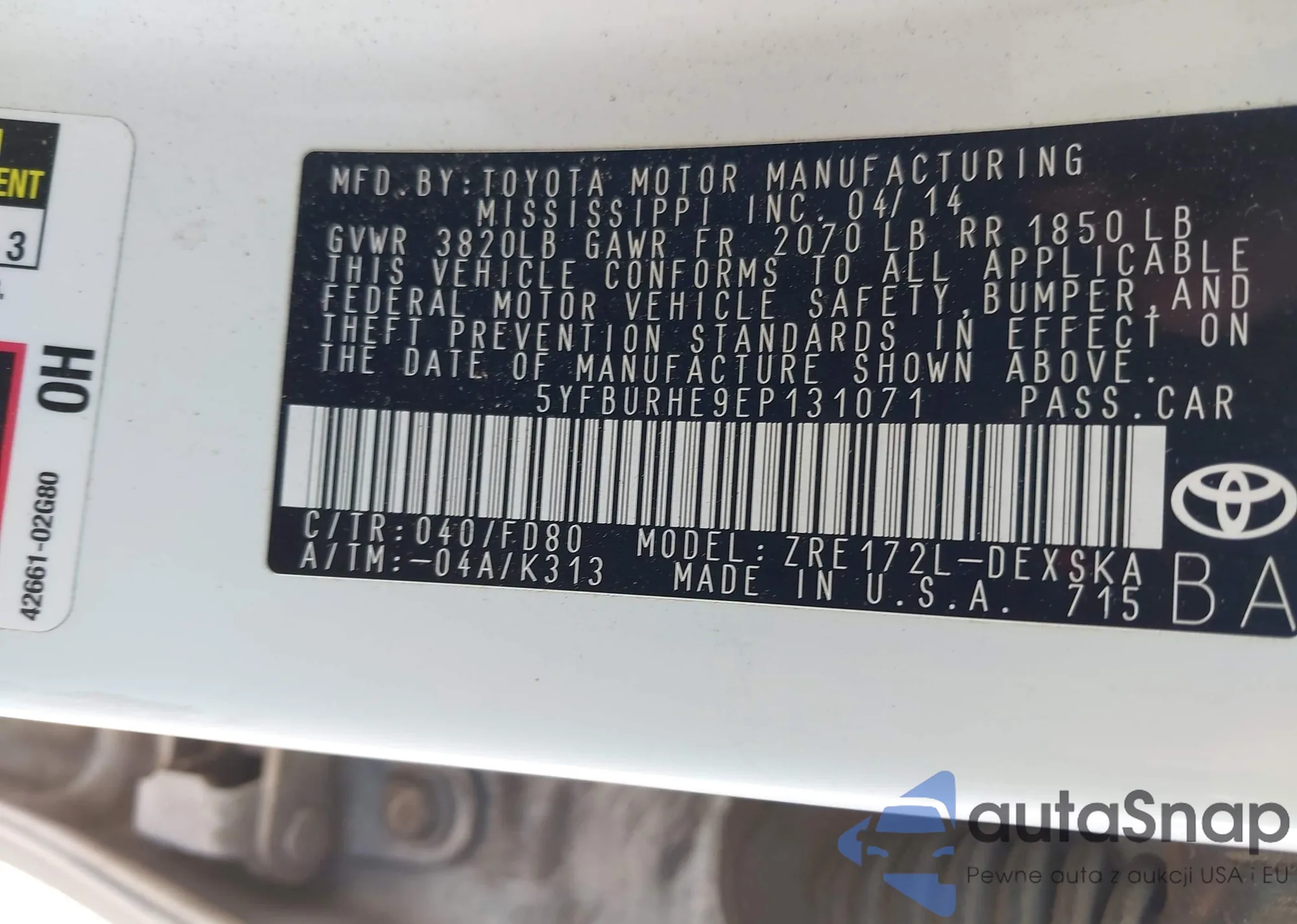 • VIN 5YFBURHE9EP131071