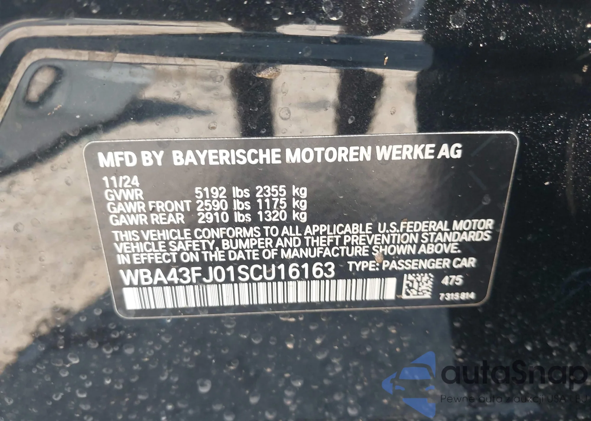 LOT: 43153517 VIN: WBA43FJ01SCU16163