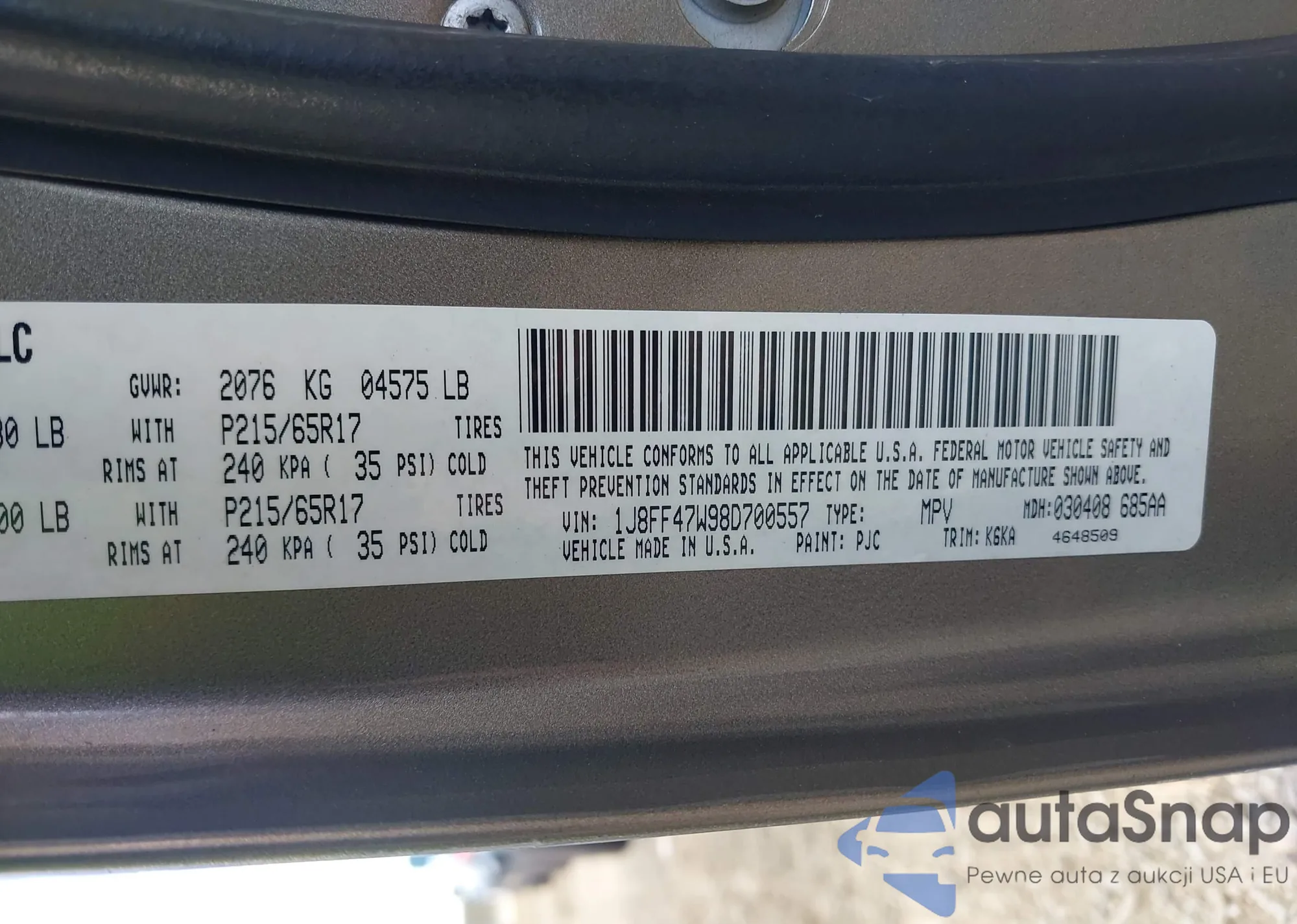 • VIN 1J8FF47W98D700557