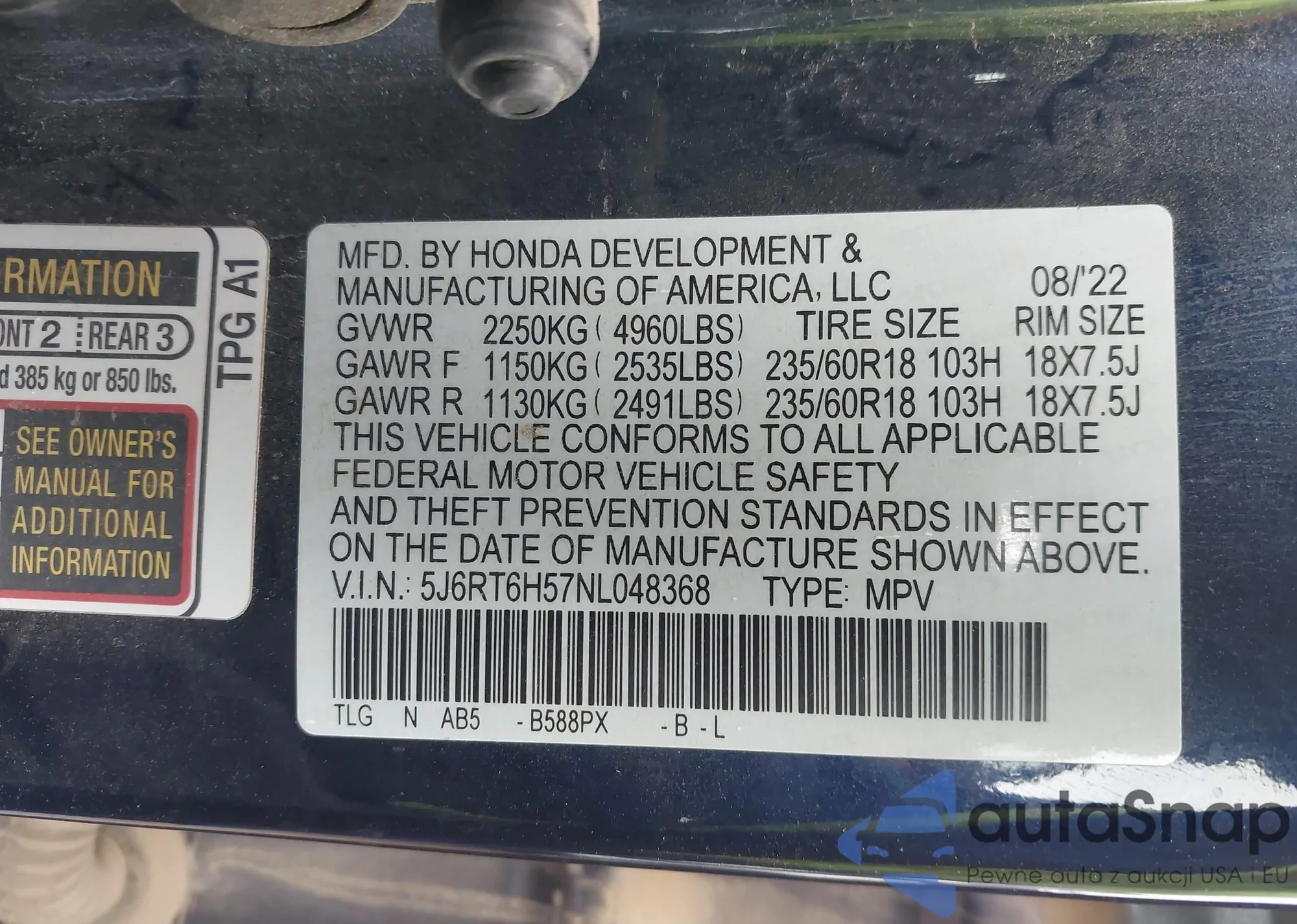 • VIN 5J6RT6H57NL048368