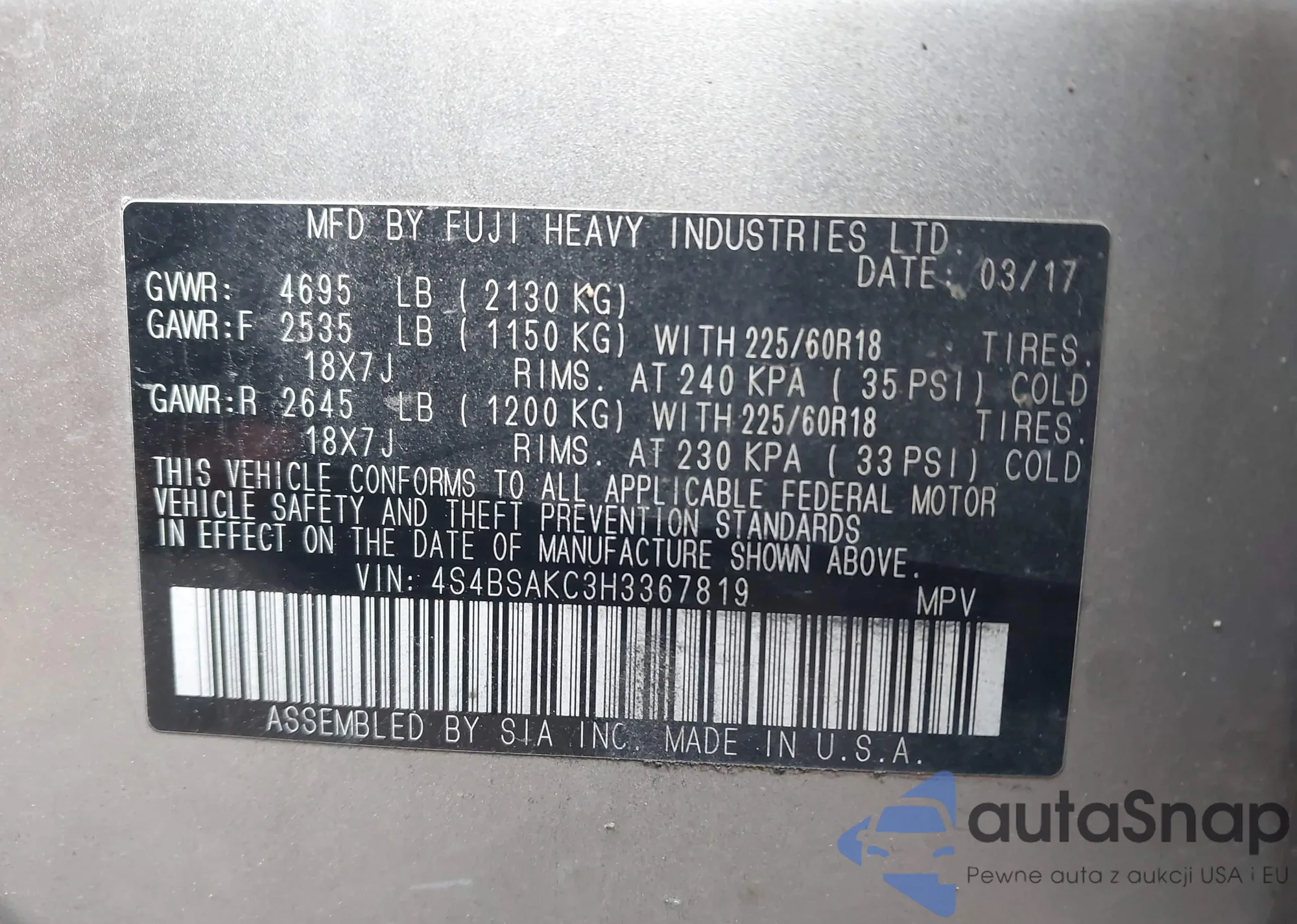 • VIN 4S4BSAKC3H3367819