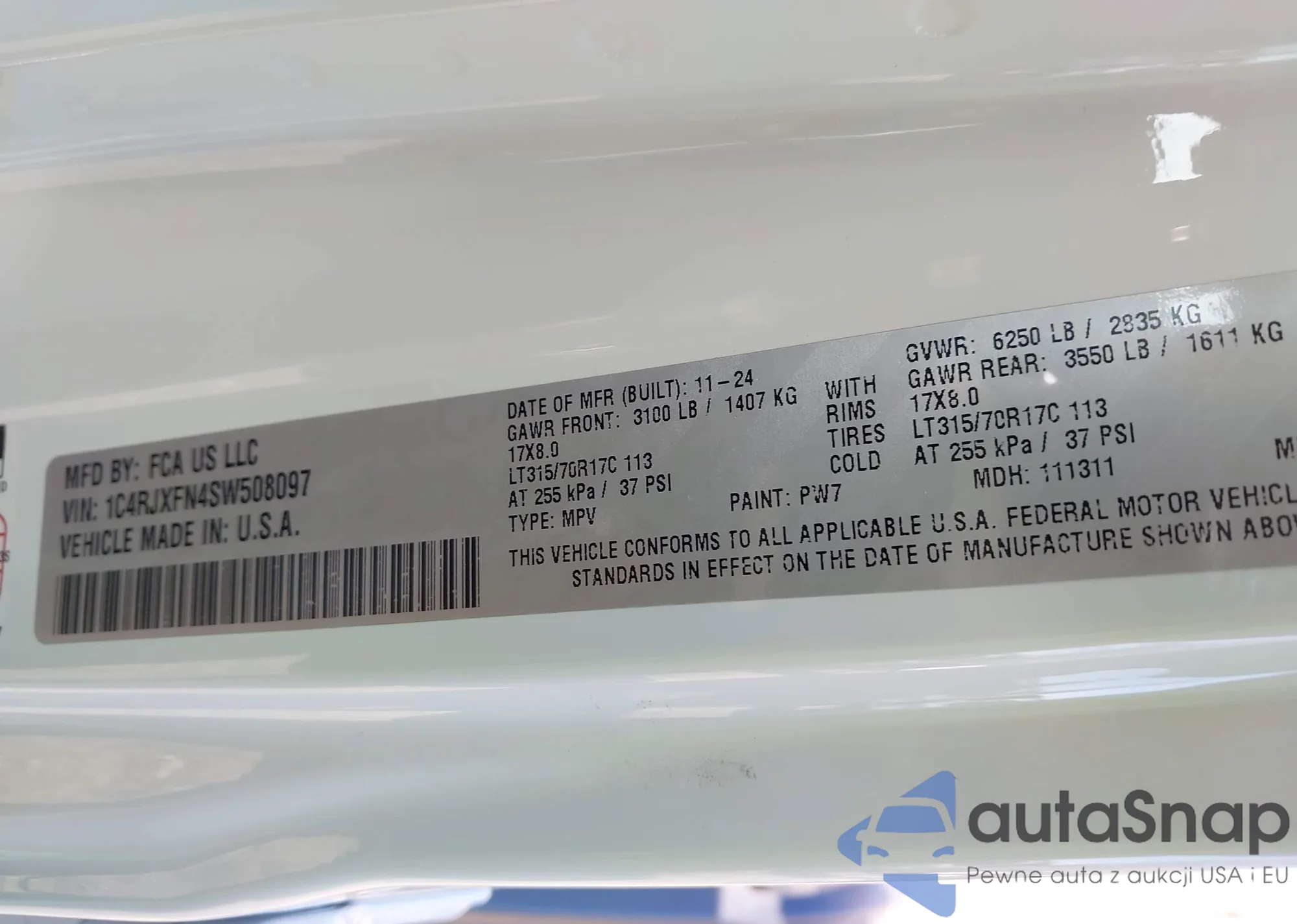 LOT: 43813954 VIN: 1C4RJXFN4SW508097