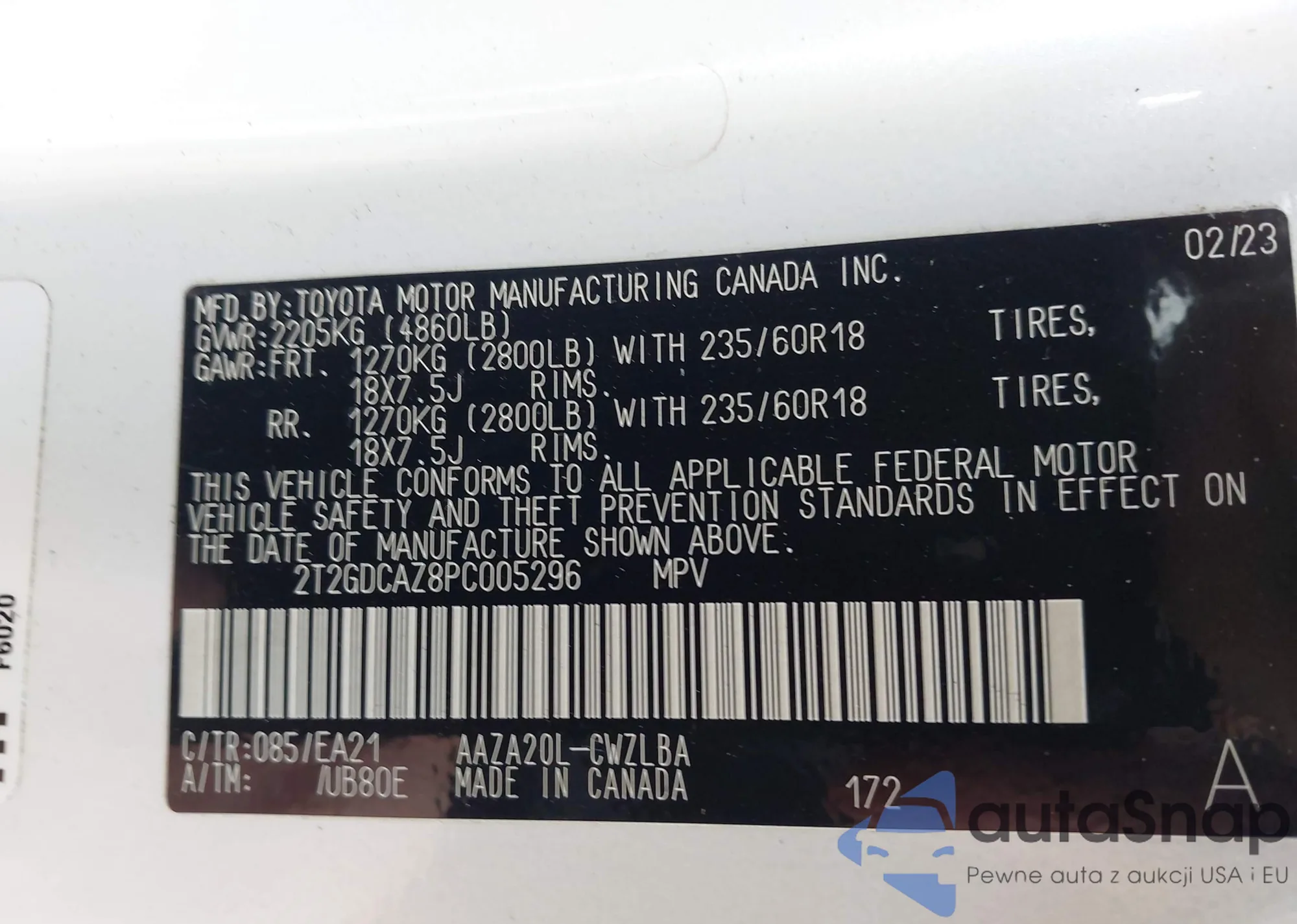• VIN 2T2GDCAZ8PC005296