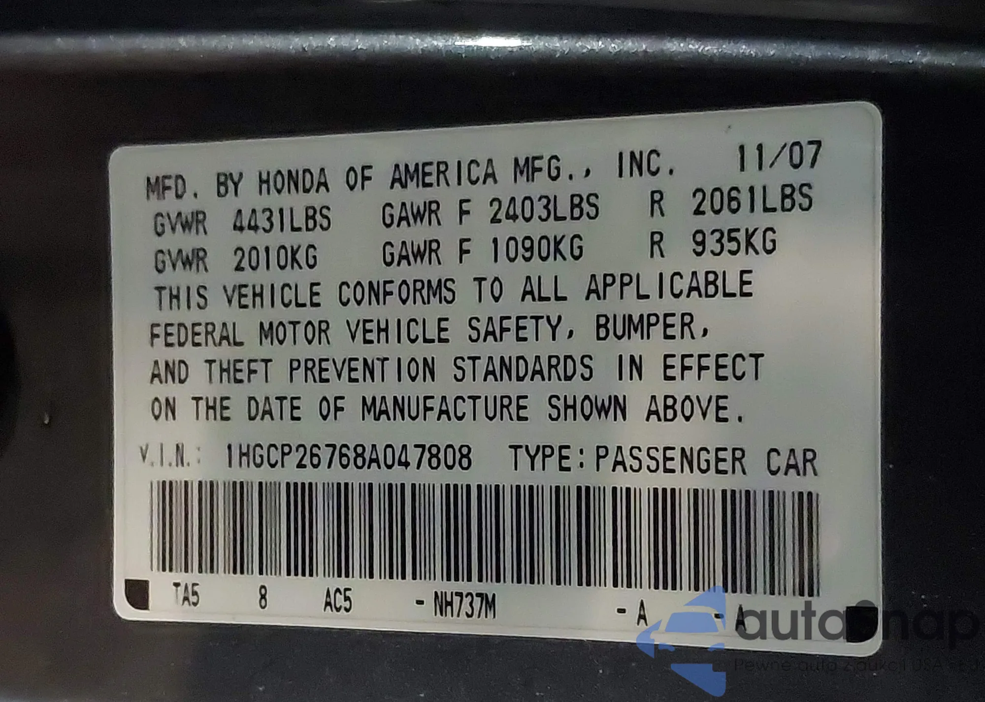 LOT: 43864043 VIN: 1HGCP26768A047808