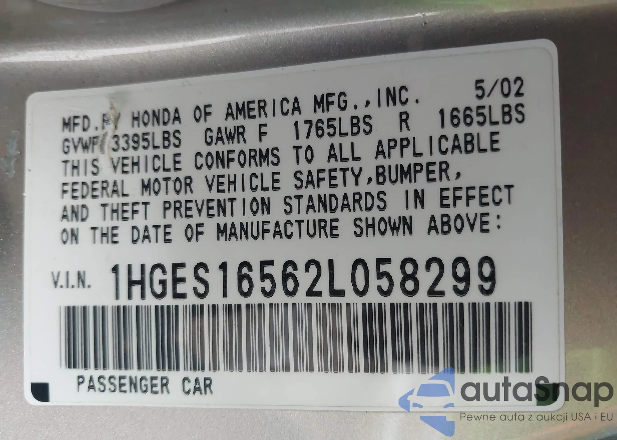 LOT: 44030056 VIN: 1HGES16562L058299