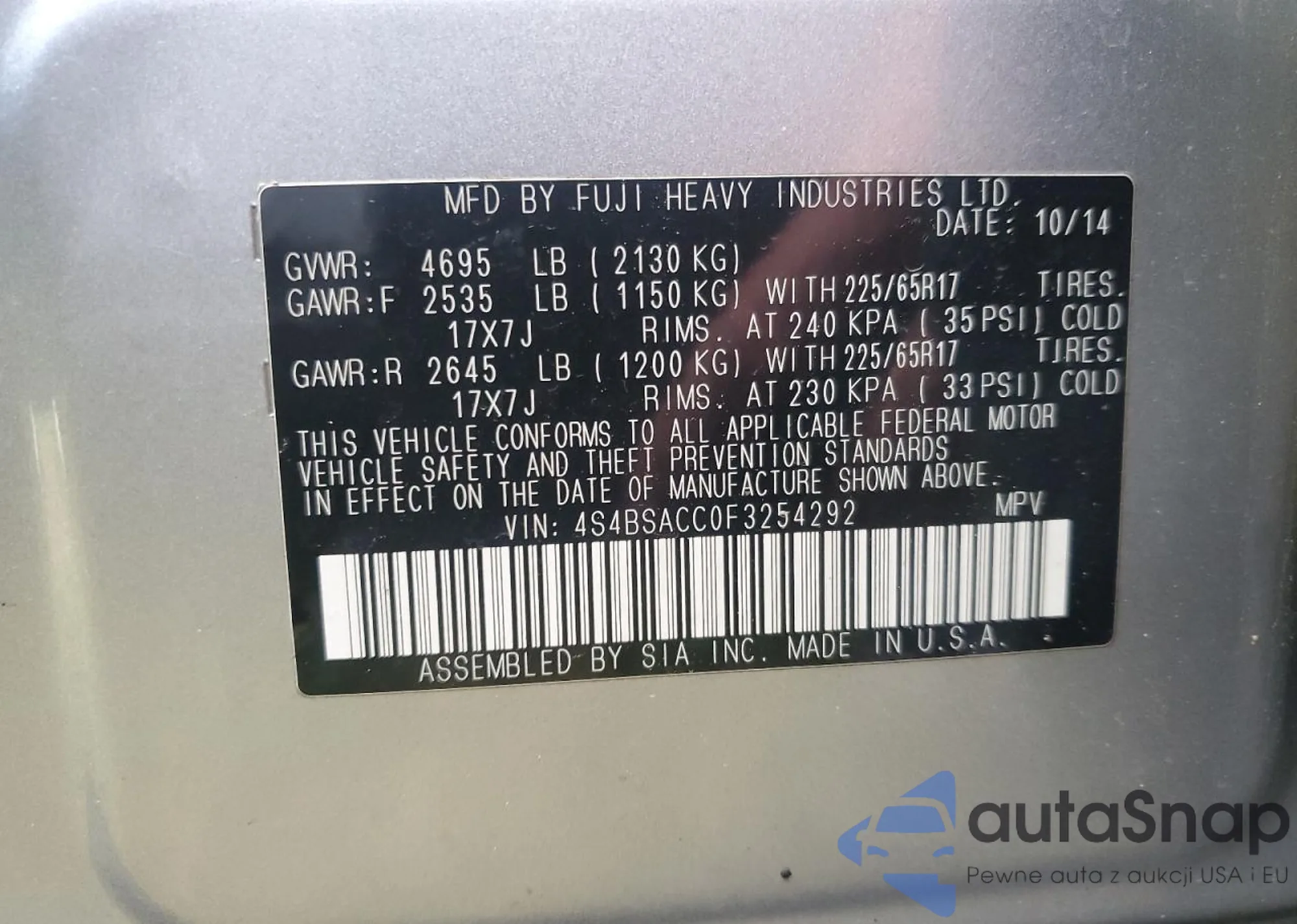 LOT: 80947925 VIN: 4S4BSACC0F3254292