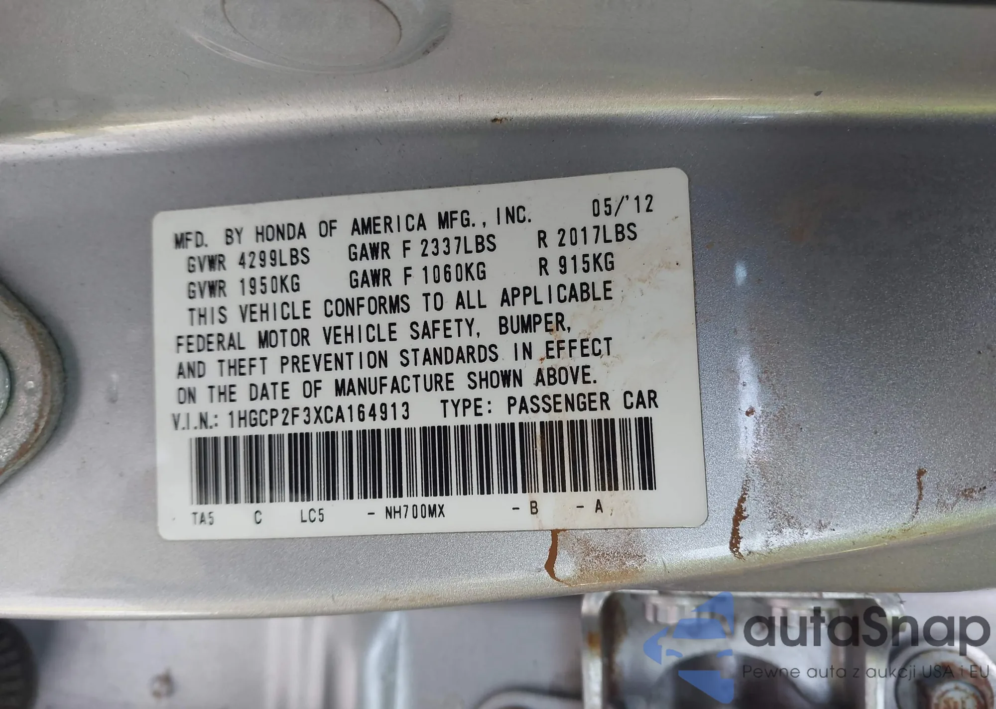 LOT: 44020209 VIN: 1HGCP2F3XCA164913