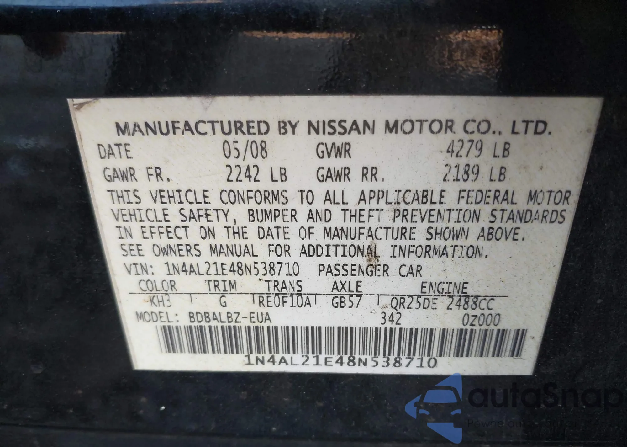 LOT: 44020307 VIN: 1N4AL21E48N538710