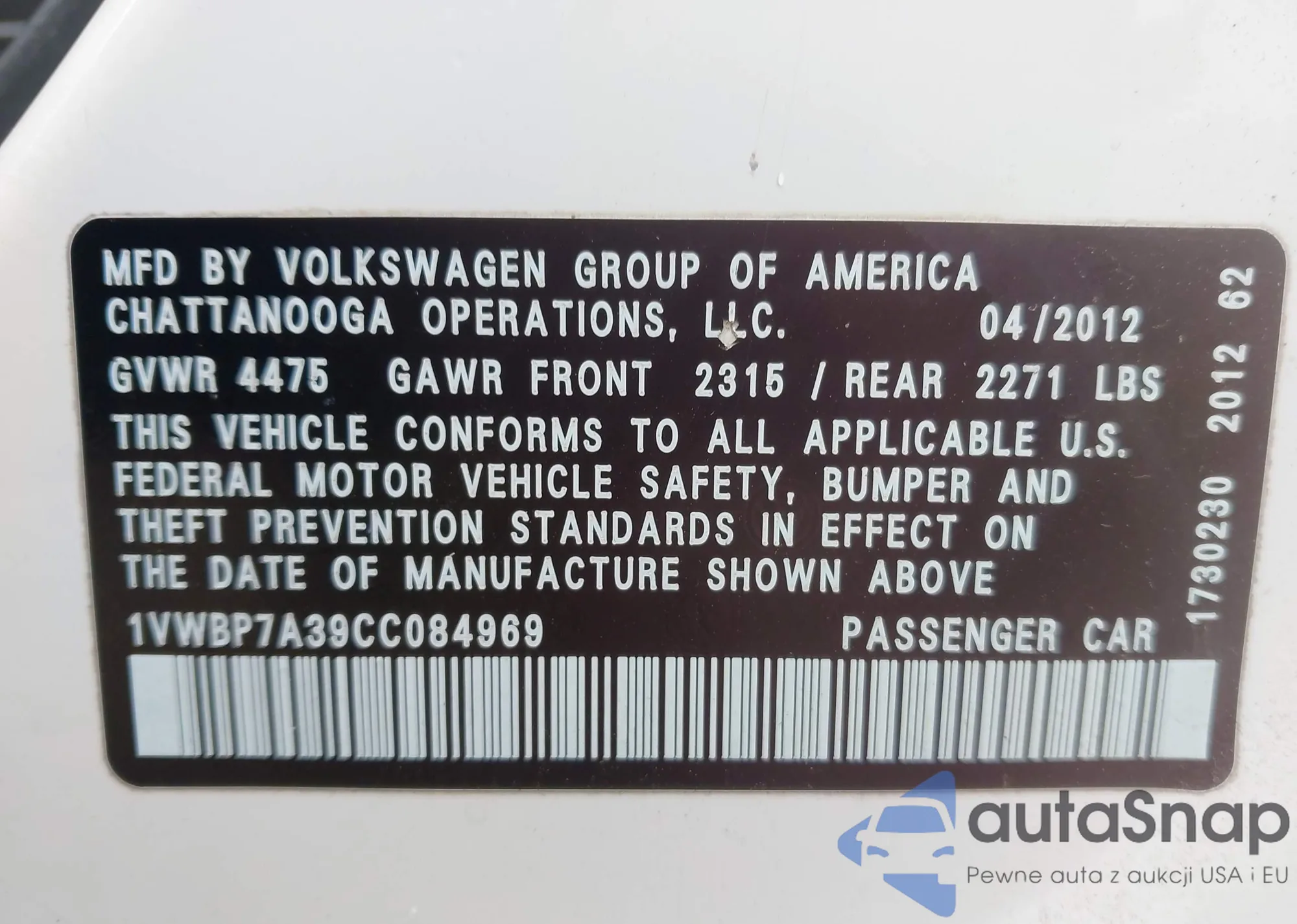 LOT: 44109233 VIN: 1VWBP7A39CC084969