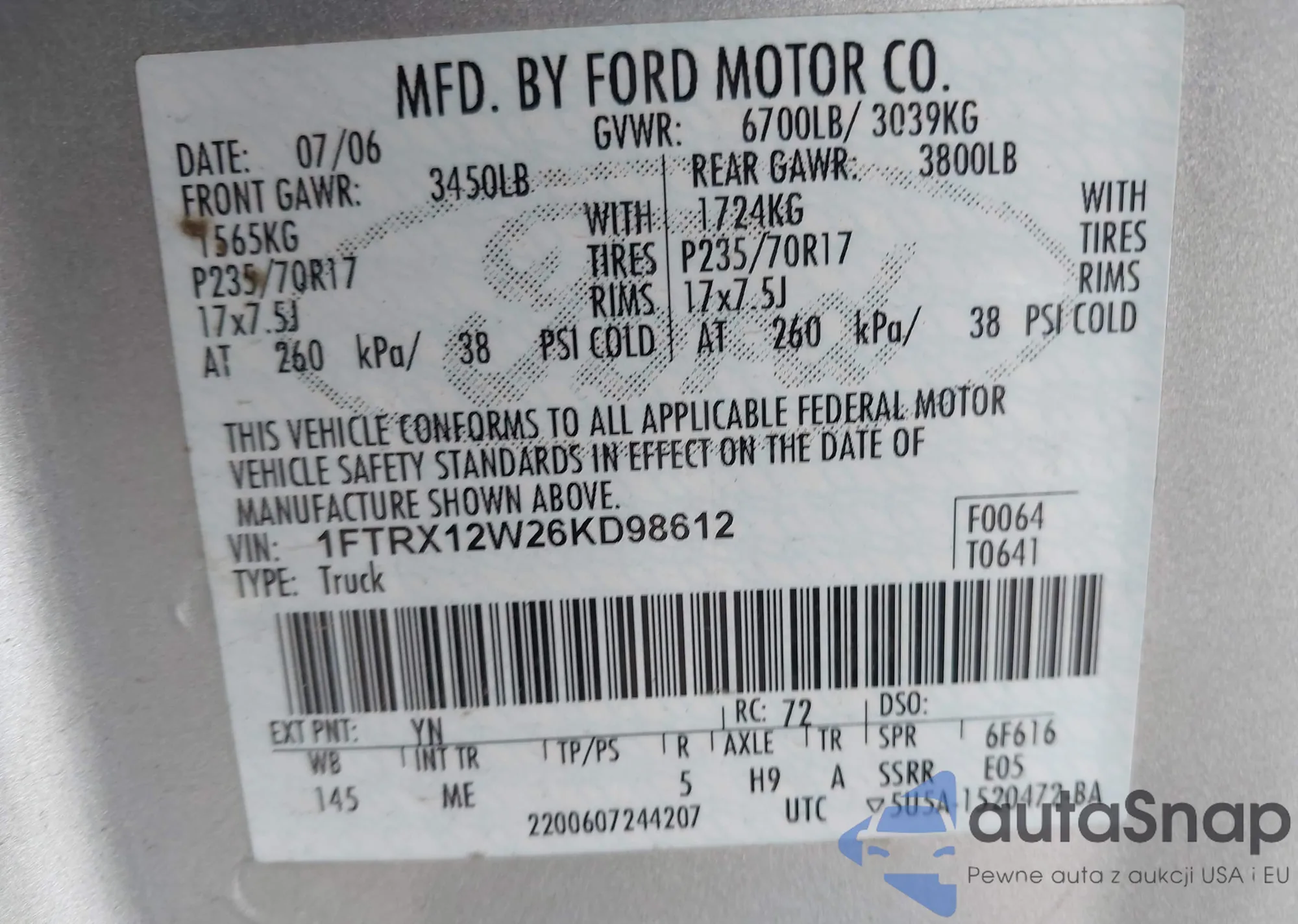 • VIN 1FTRX12W26KD98612