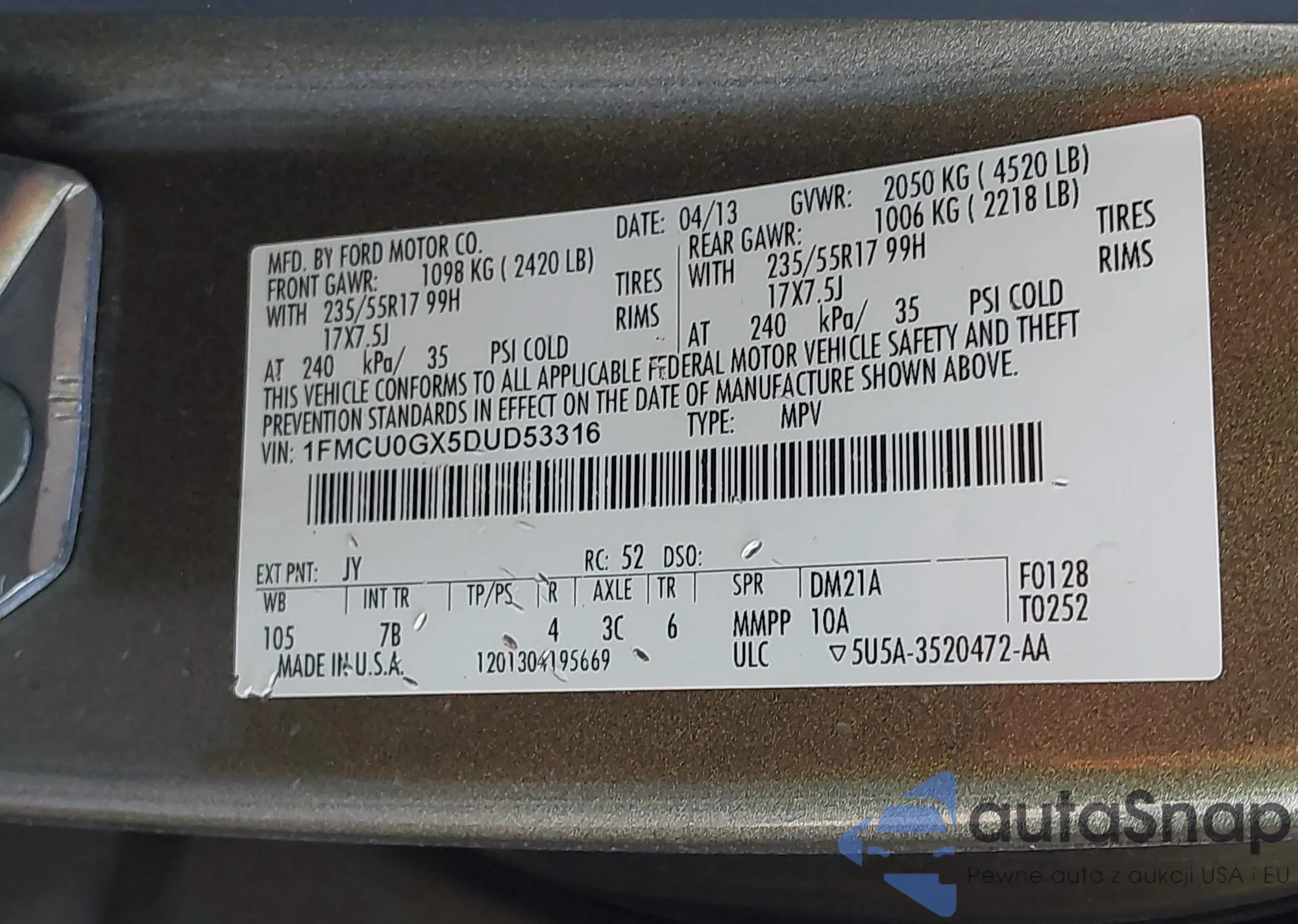 • VIN 1FMCU0GX5DUD53316