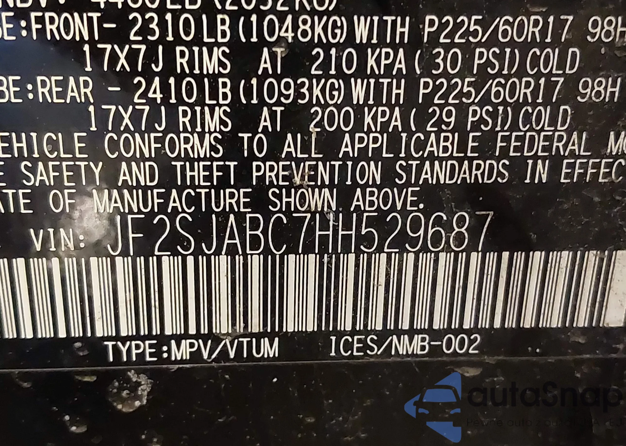 LOT: 43953238 VIN: JF2SJABC7HH529687